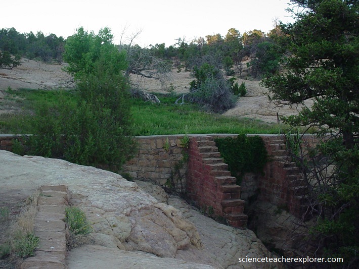 Spruce Tree house formed the core of a community of fourteen sites holding 150 to 200 people packed into this canyon head next to a strong spring. Pictured below is a short distance to the north in the head of Spruce Tree Canyon, where the strongest known spring in the Mesa Verde is located. Notice the dam to hold back the water.