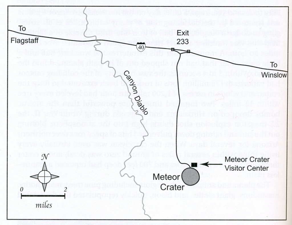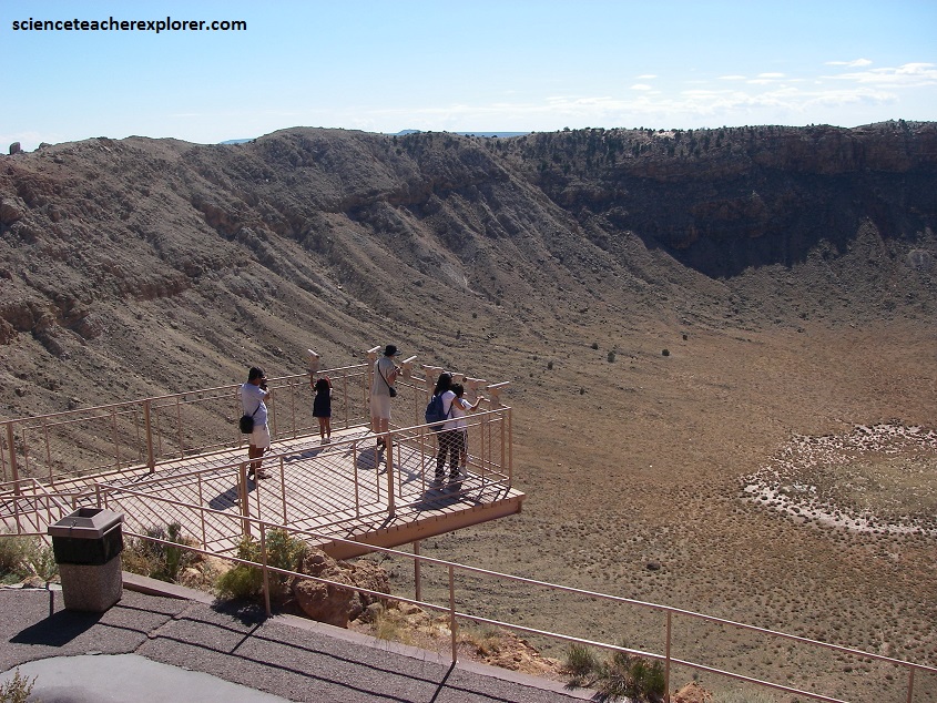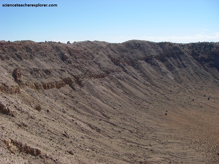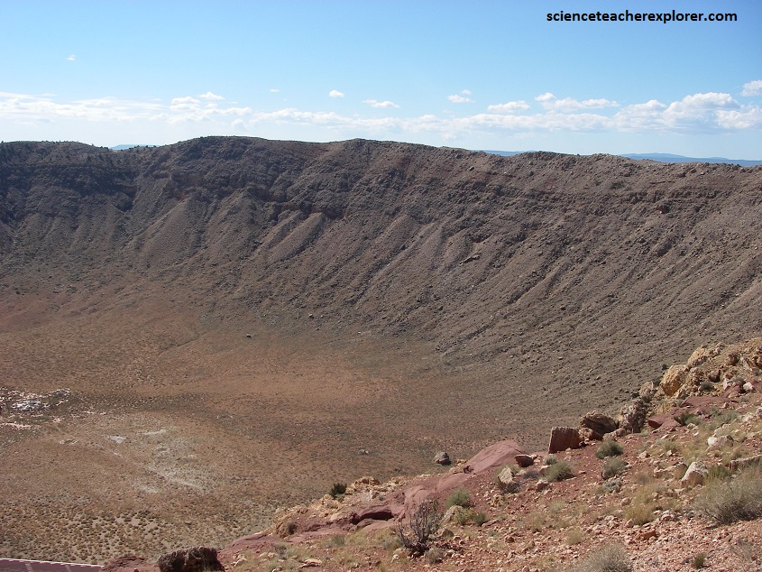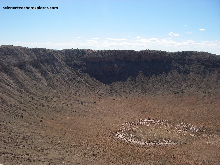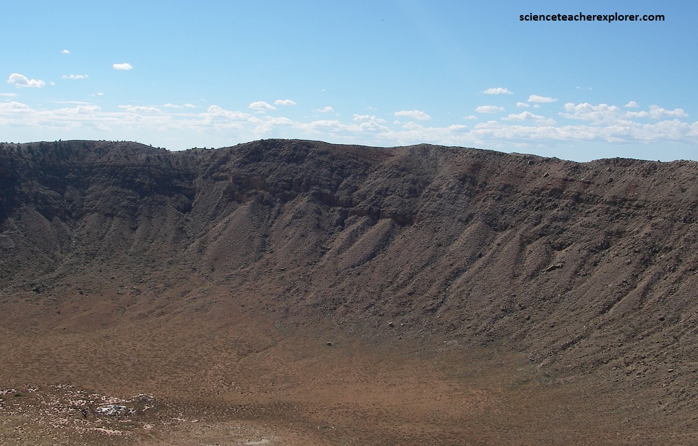 Commonly known simply as Meteor Crater, the Barringer Meteorite Crater is 1360 meters across and 190 m deep. A rim surrounding the crater rises 20-60 m above the flat plateau and is composed of jumbled rock fragments ranging from particles as small as 1 micrometer to boulders as big as houses.