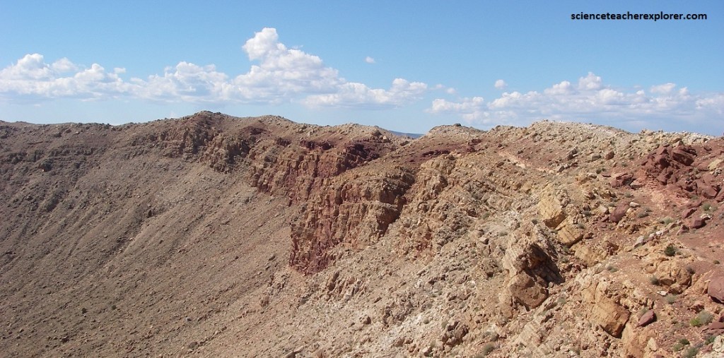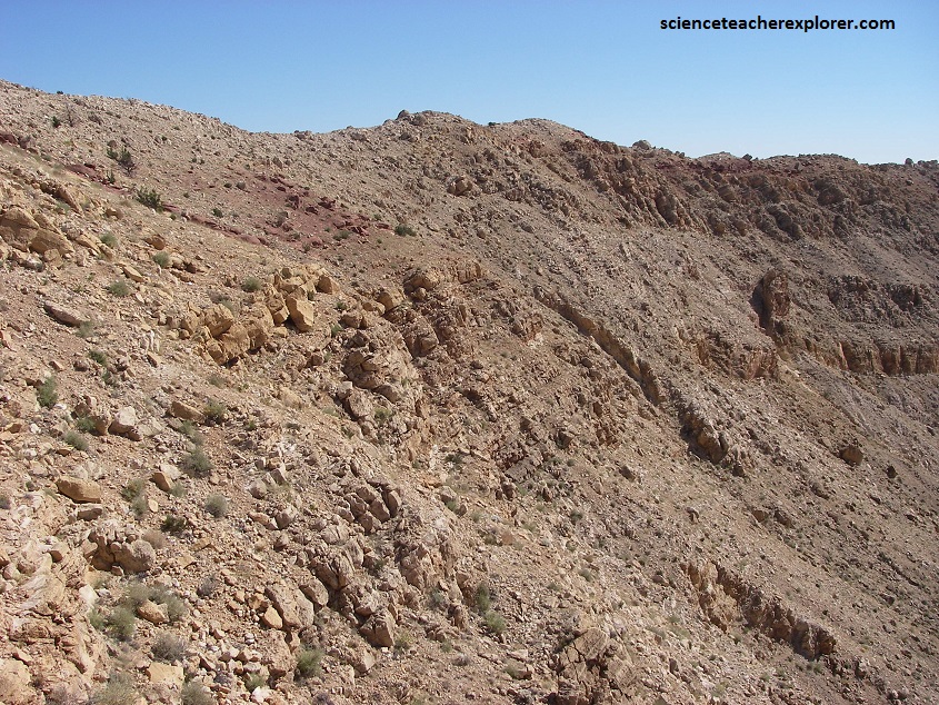 Imaged above, Meteor Crater was gouged into late Paleozoic through early Mesozoic layers typical of this part of the Colorado Plateau. Looking west from any of the crater overlooks, I could see layers of red Moenkopi formation rock near the crater’s rim. Below it lies the gray, layered cliff band of 270-million-year-old Kaibab limestone. Below the Kaibab, the Coconino sandstone, (275-million-year old rock formed from ancients sand dunes), makes up the cliff to the north and east and continues to the crater’s floor. This sequence is then reversed above the Moenkopi as debris blown upward and then down on the rim. This helped prove to Barringer that this was an impact structure.