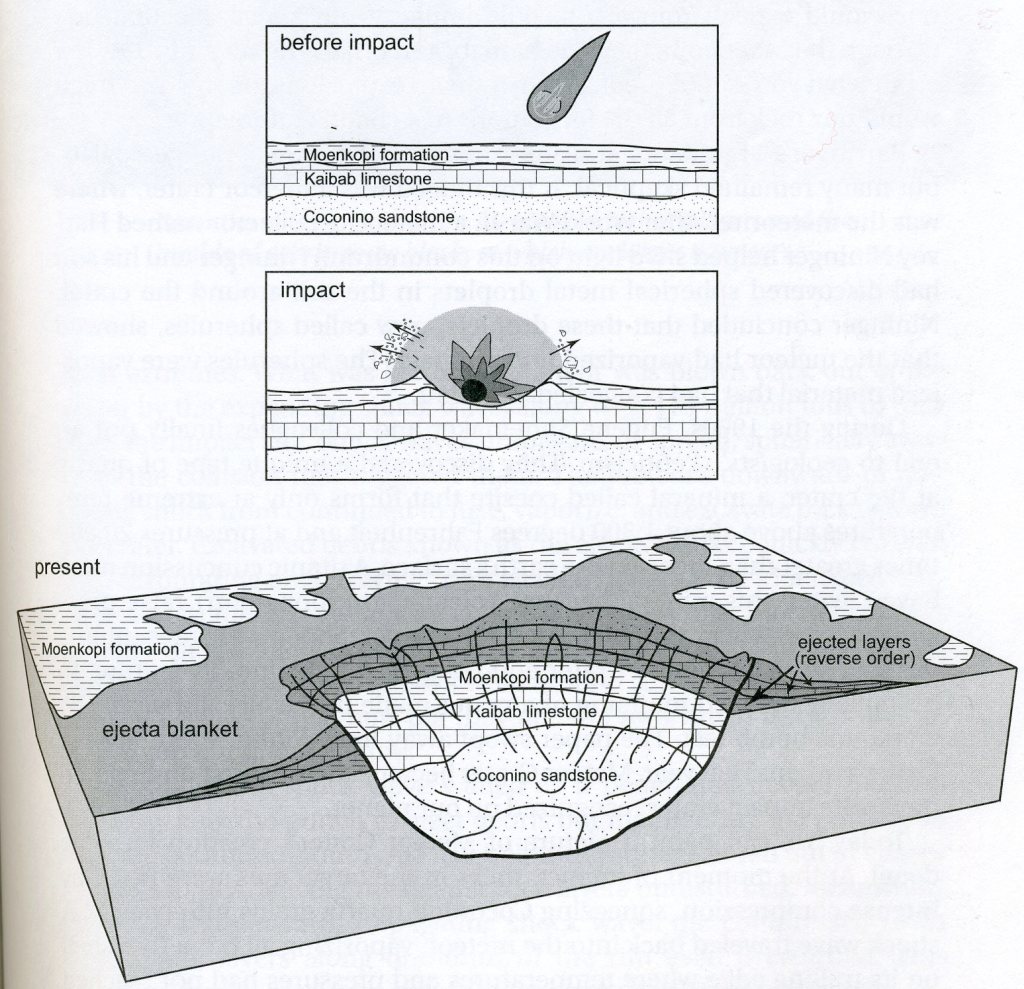 Shoemaker presented 2 main pieces of evidence. 1) The rim around the crater is composed of the same rock formations that underlie the surrounding Colorado Plateau, except that they are upside-down. [This could only happen if a shockwave shattered, uplifted, and overturned the rocks]. 2) Coesite and stishovite were found in the sandstone blasted by the impact. [Both are denser type of quartz that only form due to the greater pressures of an Meteorite Impact].