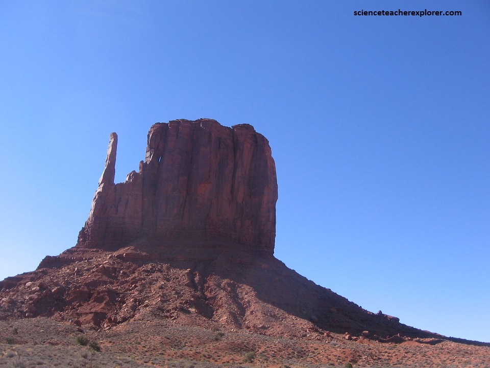 The base of the Buttes (or Monuments) themselves are composed of Permian Organ Rock Shale. It is nearly 230 m thick. This Permian shale layer was deposited by marine environments such as streams and tidal flats. This time of deposition led to the creation of dark brown and red mudstones and siltstones. Since this a shale layer, it erodes into a low, eastward, sloping angles (which is seen as the apron).