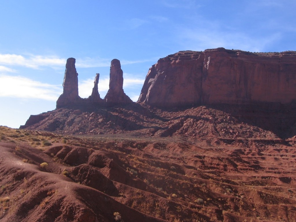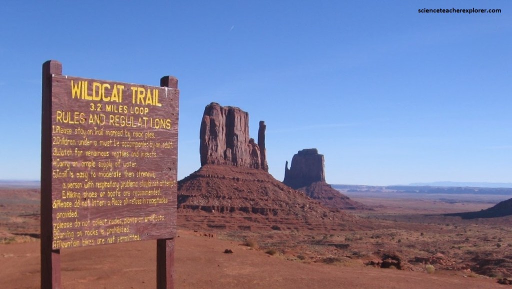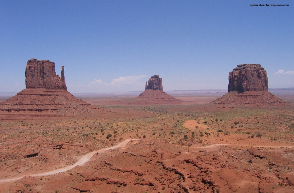 Through Monument Valley you can see buttes rising sometimes 330 meters from the ground. The rocks found there are mainly sedimentary, ranging from the Permian to the mid-Jurassic. The four main formations that form the buttes are the Organ Rock Formation (the apron), De Chelly Formation (the cliff face), the Moenkopi Formation (the cap) and the Shinarump (above the cap) .