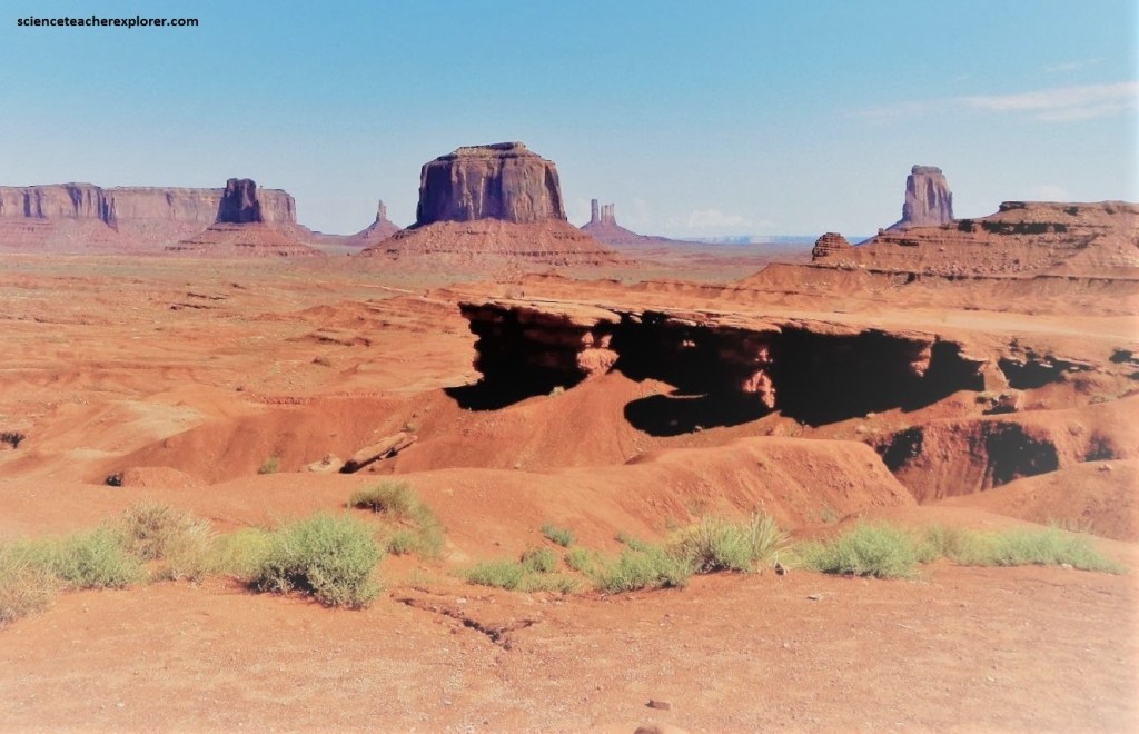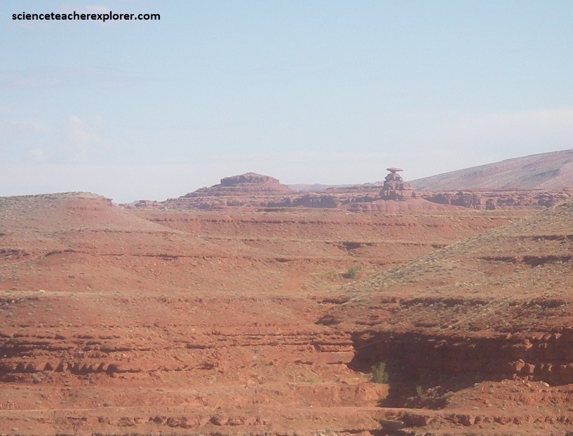 Pictured above is a view above the “Valley of the Gods”, (northeast of Monument Valley. However, in the “Valley of the Gods”, the resistant Permian Cedar Mesa sandstone lies atop the weaker Permian Halgaito shale. Recall, in Monument Valley, the Permian steep-sided Permian Chelly sandstone rested on a sloping base of the Permian Organ Rock shale. Like Monument Valley, “Valley of the Gods” offer intimate glimpses into a landscape of mesas, buttes, and spires. These isolated structures leaves behind the eroding southern margin of Cedar Mesa.