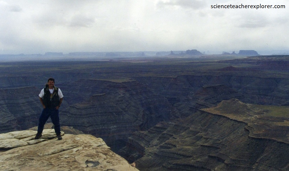 The San Juan River twists and turns through the meander below, flowing a distance of over 10km while advancing a few kilometers west toward Lake Powell. Pictured above is the result of over 300 million years of geologic activity. The oldest rocks are found at the bottom of the canyon, (310 million years old) and the youngest are all around you on the mesa top, (270 million years old). Actually, there are two formations visible from the overlook: the underlying Paradox formation (middle Pennsylvanian) and the overlying Honaker Trail formation (late Pennsylvanian), upon which we stood on.