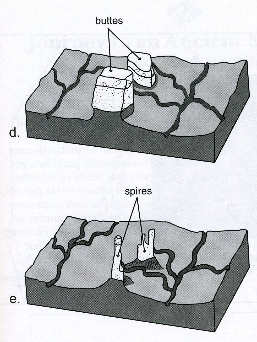 e) Continued erosion carve the buttes into spectacularly slender spires such as the Totem Pole or or the Three Sisters, (pictured below).