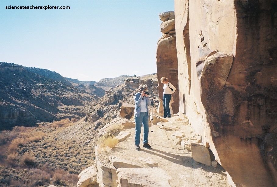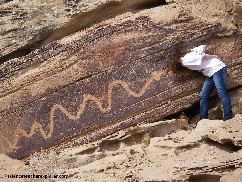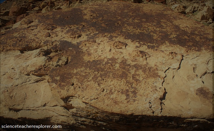 From the Rochester Petroglyph Panel Site, we continued down the Moore Cutoff Road, towards the east, for an additional 8 km. There, a pullout on the left (north) side of the road near the base of Molen Reef, (an asymmetrical ridge composed of the approximately 90 million year old Late-Cretaceous Mancos-Shale). The Mancos Shale’s hard and resistant Ferron Sandstone Member caps the ridge, and the underlying Tununk Member is exposed on the ridge’s cliff face.