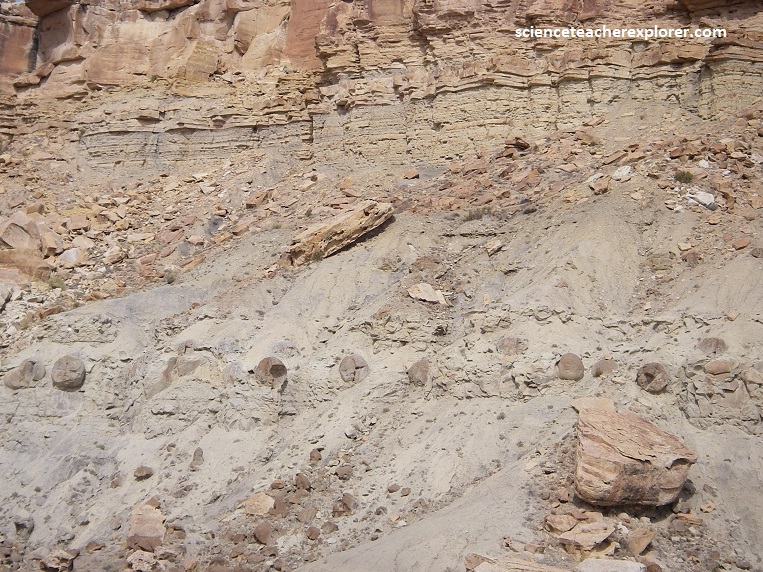 Short Canyon contains large sandstone concretions scattered around the cliff base. These 1-3meter-diameter spherical concretions weather out of a sandy, ledge-forming rock layer mid-way up the cliff within the Tununk Member of the Mancos Shale.
