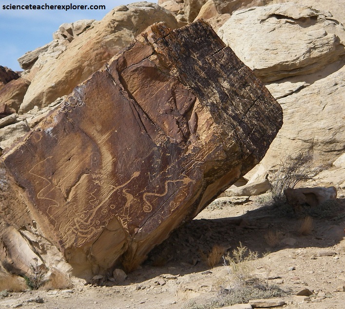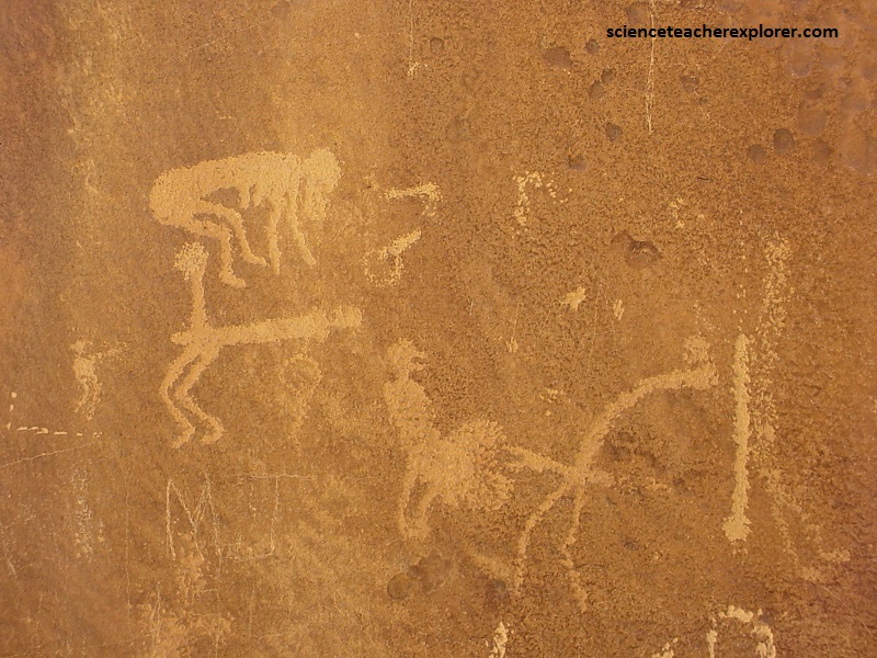 Picture above and below, various petroglyphs are etched on fallen blocks of Ferron Sandstone. Notice the Kokopelli figure with the snake grouping. Kokopelli is a fertility deity and trickster, usually depicted as a humpbacked flute player who is venerated by some Native American cultures in the Southwest.