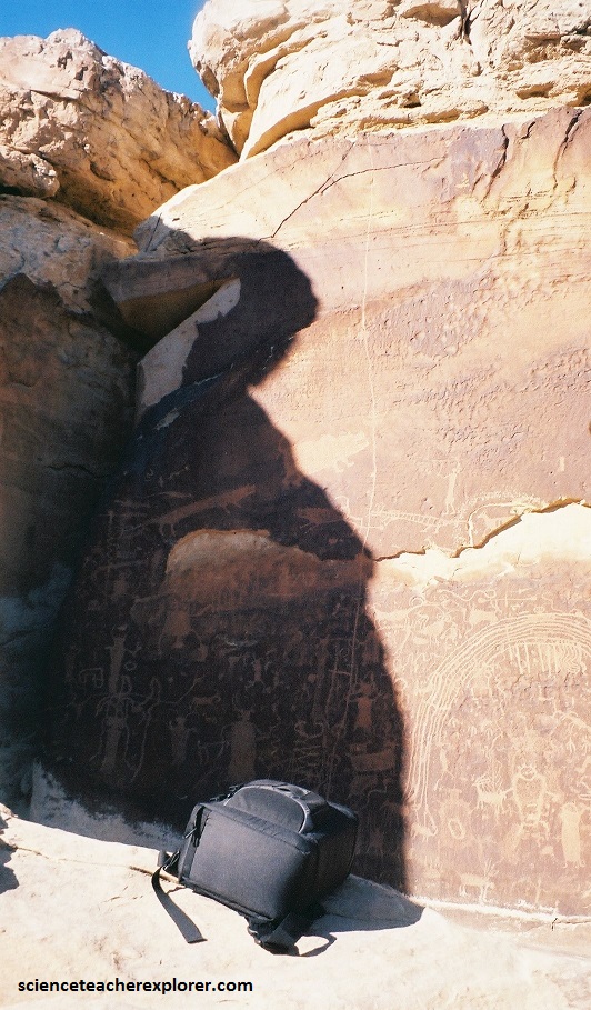 Years prior to the trip, I had the opportunity to interview the Piute Chief from Garrison, Utah (a remote village on the Utah and Nevada Stateline). He instructed me to investigate this particular site on the Autumnal Equinox, (September 22nd). There, I would be see a “Pregnant Maiden” from the “Spirit World”. Apparently, the single pecked line that I mentioned above is a doorway to the “Spirit World”. So here I was, on September 22, 2010, waiting for the “Pregnant Maiden” Spirit to appear with witnesses. At about 10 AM, there appeared a shadow figure that one of the group members saw. I took a picture of it below.