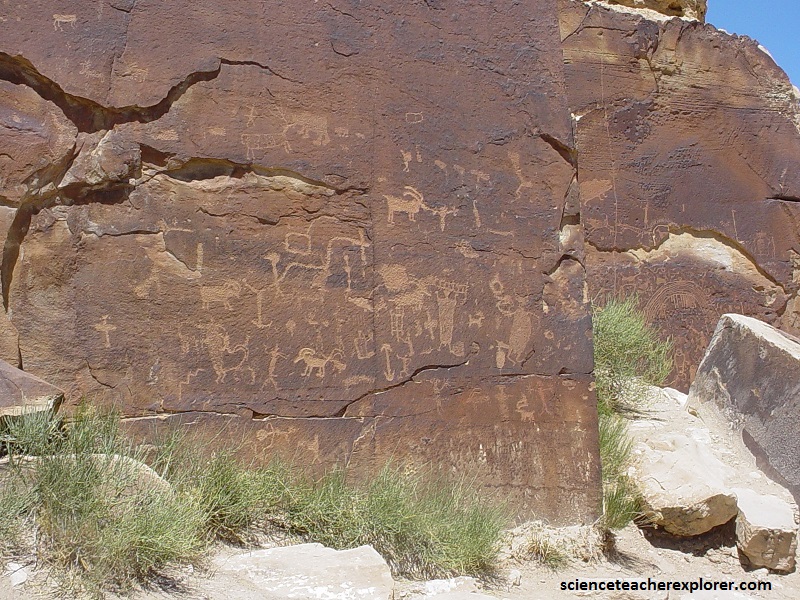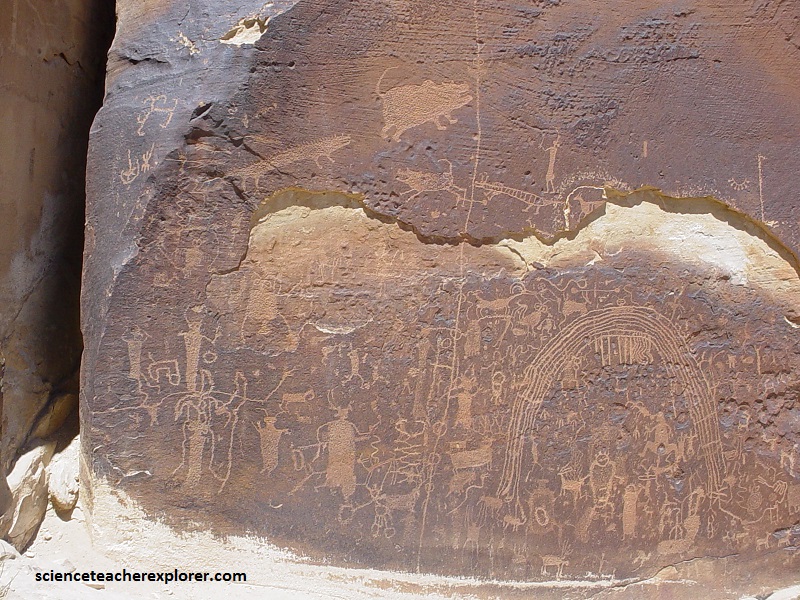 The Rochester Rock-Art Panel is a large, densely packed collection of Archaic and Fremont petroglyphs that include some very unusual images. Pictured above, centrally positioned, is a rainbow-like arch of eight carefully pecked parallel lines. Beneath the rainbow is a female human that seems to be displayed in a sexual nature with finger sized hole for her vagina. Of a less erotic nature are numerous anthropomorphs in the Fremont Native style. There are bighorn sheep and abstract designs. Most surprising, however, are numerous fantastic animals, made prehistorically. One resembles an alligator, another looks like a hippopotamus. Others are purely imaginary, even nightmarish that seem to be coming out of a single pecked line the vertically reaches to the to of the cliff face. They all appear highly aggressive with open mouths and bared teeth.