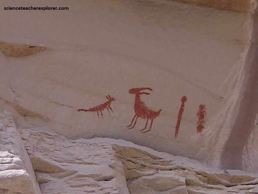 Near where Short Canyon divides, and 75 meters up the slope to the right and facing souteast, is a small anle of red pictographs under a protective overhang, (pictured below).