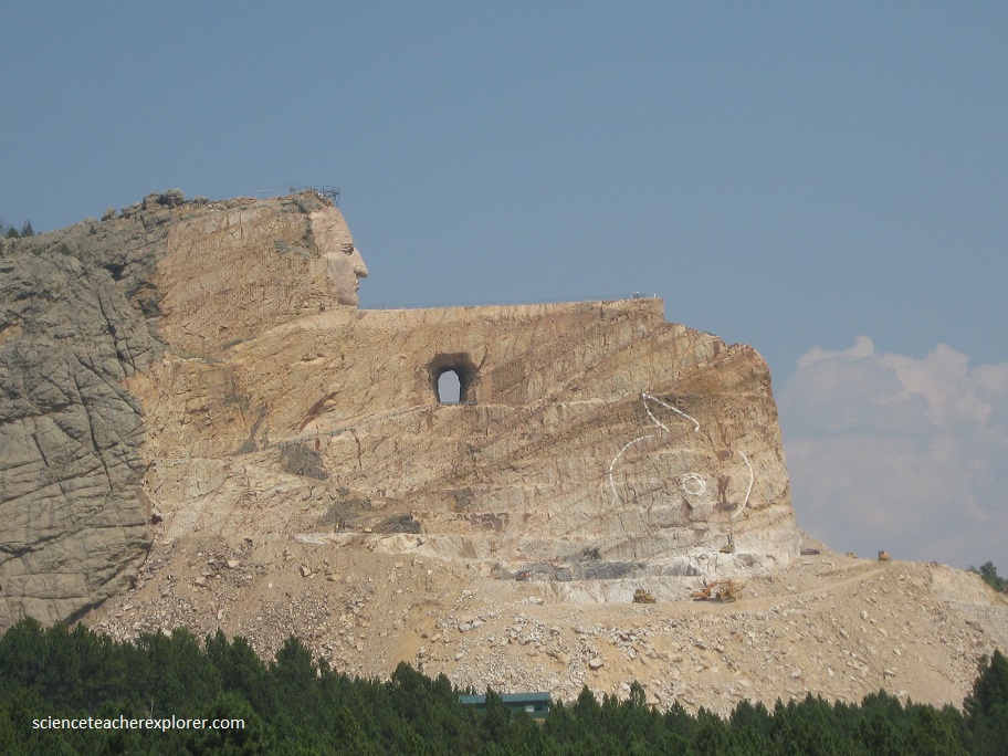 The Crazy Horse Memorial is geologically very similar to Mount Rushmore: a pod of granitic migmatite surrounded by schists and slates. This and many other knobs in the Black Hills stand above their surroundings because they are more resistant than the metamorphic rocks around them.