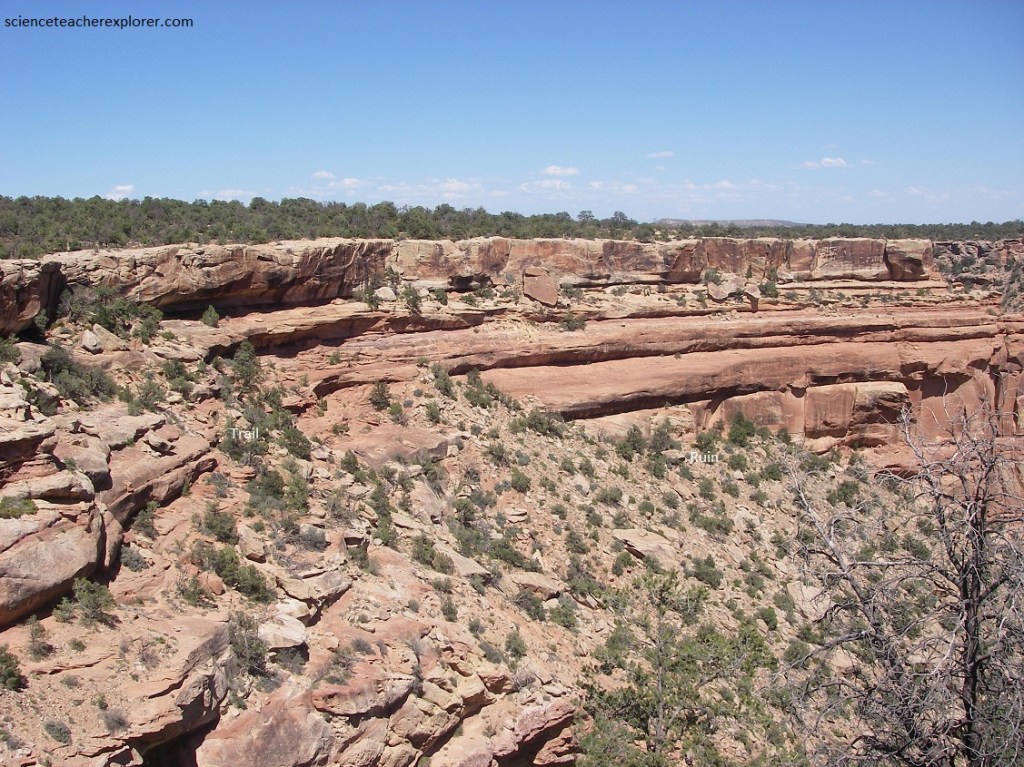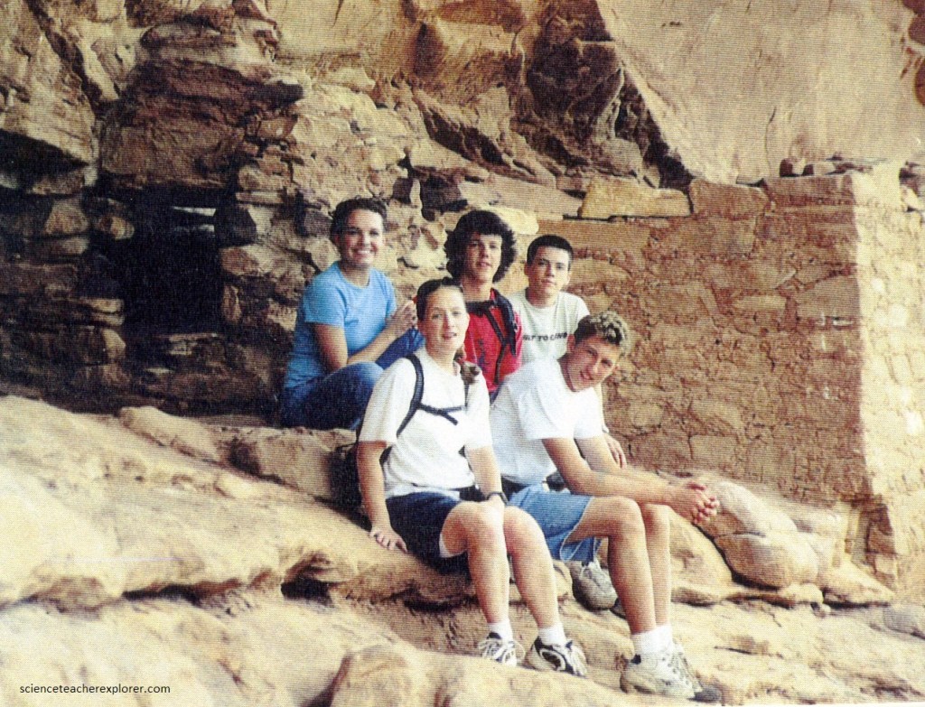 However, the main reason we were at Mules Canyon, was to explore some of the “Ancient Pueblo” Ruins within the North and South Mule Canyons. Our student groups started in the morning with the North Fork of Mule Canyon. The North Fork of Mule Canyon contained a few pools and shallow streams in 2001 but was usually dry. It was lightly vegetated with the floor that was mostly wide slickrock with no obstacles when walking upstream. The canyon contained four major groups of ruins but we only had time to visit a few of them due to time.