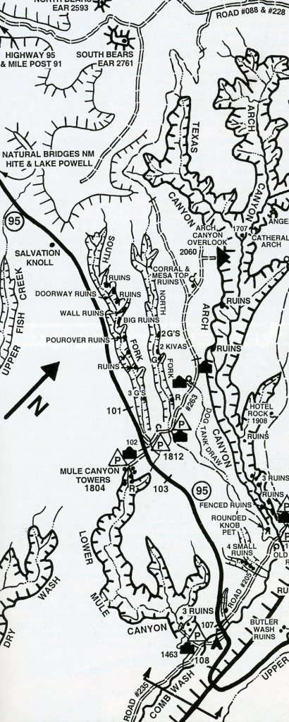 Imaged above, the Mule Canyons are locate roughly halfway between Blanding, Utah and Natural Bridges National Monument. To get to the North & South Forks of Upper Mule Canyon, drive along Highway 95 to between mile posts 101 & 102 and turn north onto Road #263. Imaged below, drive this graded road 500m and park beside the road at the bottom end of “South Fork of Mule”. Or drive 1.6 km from the highway and park at the lower end of the “North Fork of Mule”. If you have a 4WD, you can drive on to Texas Flat and the “Arch Canyon Overlook”. This is 9.7 km from the Highway. Too explore “Mule Canyon Towers” (or Cave Canyon Towers), turn south on Highway 95 until mile post 102 or 400m southeast from the Road #263, turn right right onto a small road and drive or walk one kilometer, (open & close the gate).