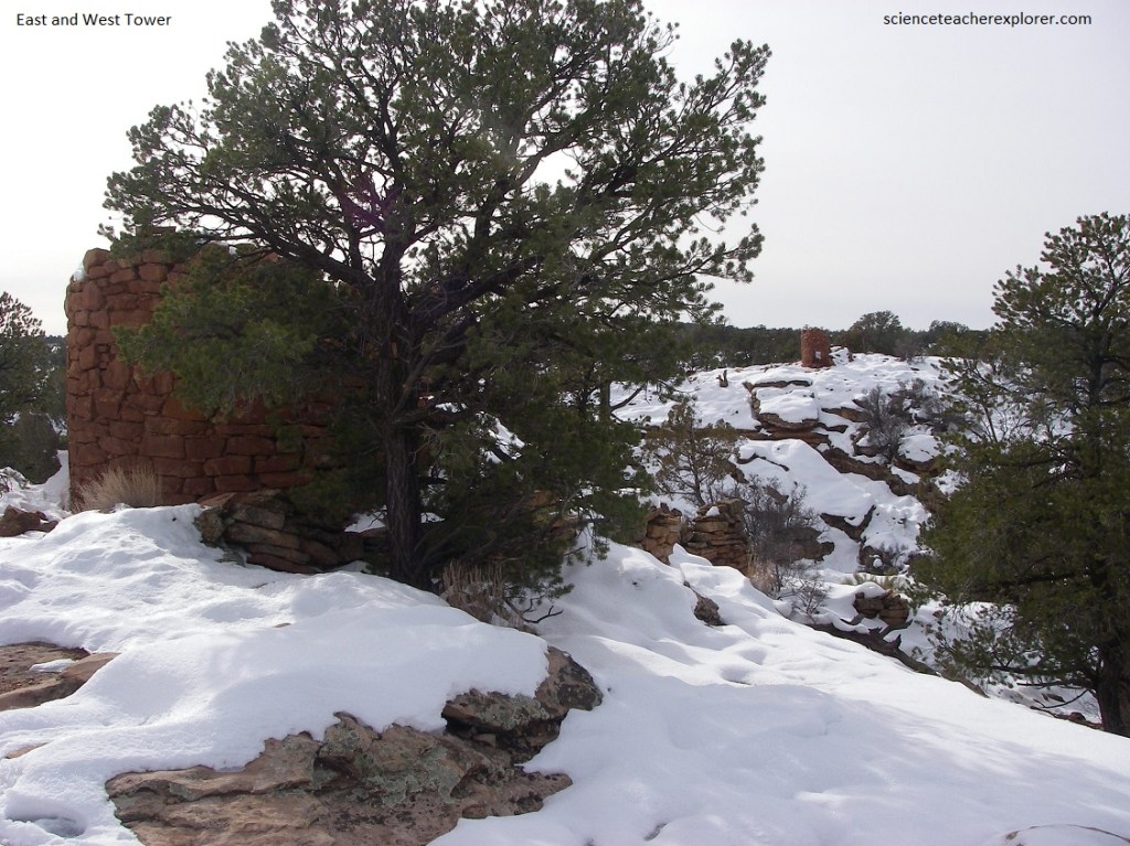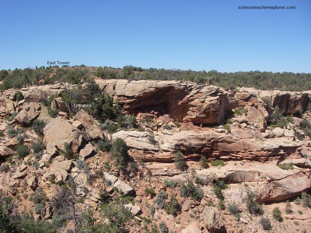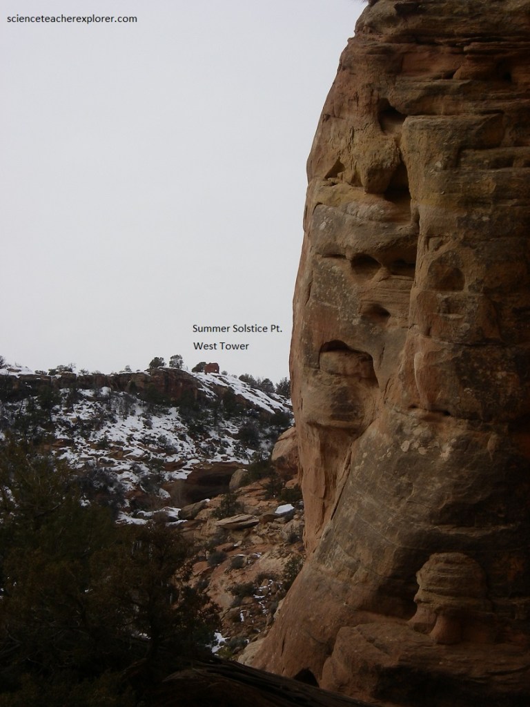 Note that the The doorway of West-Tower is intact and faces southeast along the rim, (towards me near the cliff dwelling). Measuring 65 centimeters wide and 1.3 meters tall, the base of the doorway is 50 centimeters above the foundation. (I’m thinking Sun-Rise viewing point for the Summer Solstice).