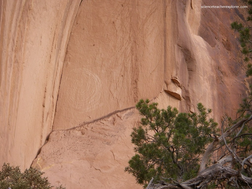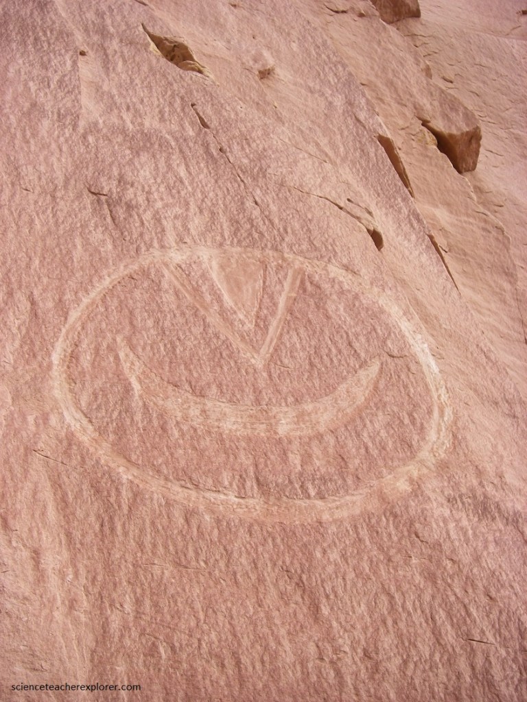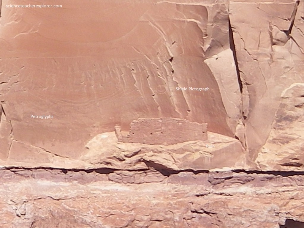 Very carefully, we climbed up into the cliff-dwelling, (behind the wall), to get a better look at the shield (pictured below). We found the cliff face behind the wall full of petroglyphs. It was a panel of petroglyphs. I told the students that the shield gave the community a shared a form of community identity and place in a location that was highly visible above the special cliff dwellings. Was I right? Maybe…….