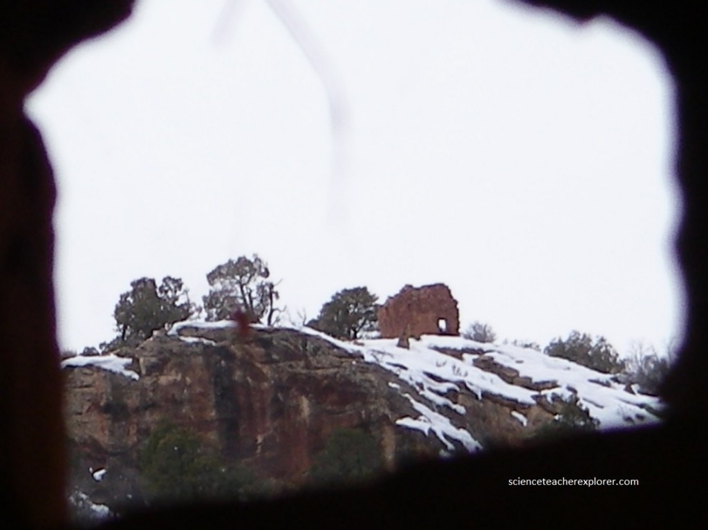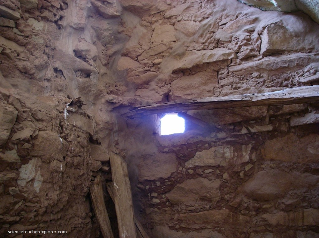 On my way back from the east side of the Canyon, I wondered if the ancient dwellings next to the cliff-dwelling had similar alignments. Pictured below is a double room dwelling that has a strange small window. This window, also seemed to be pointing at the West Tower.