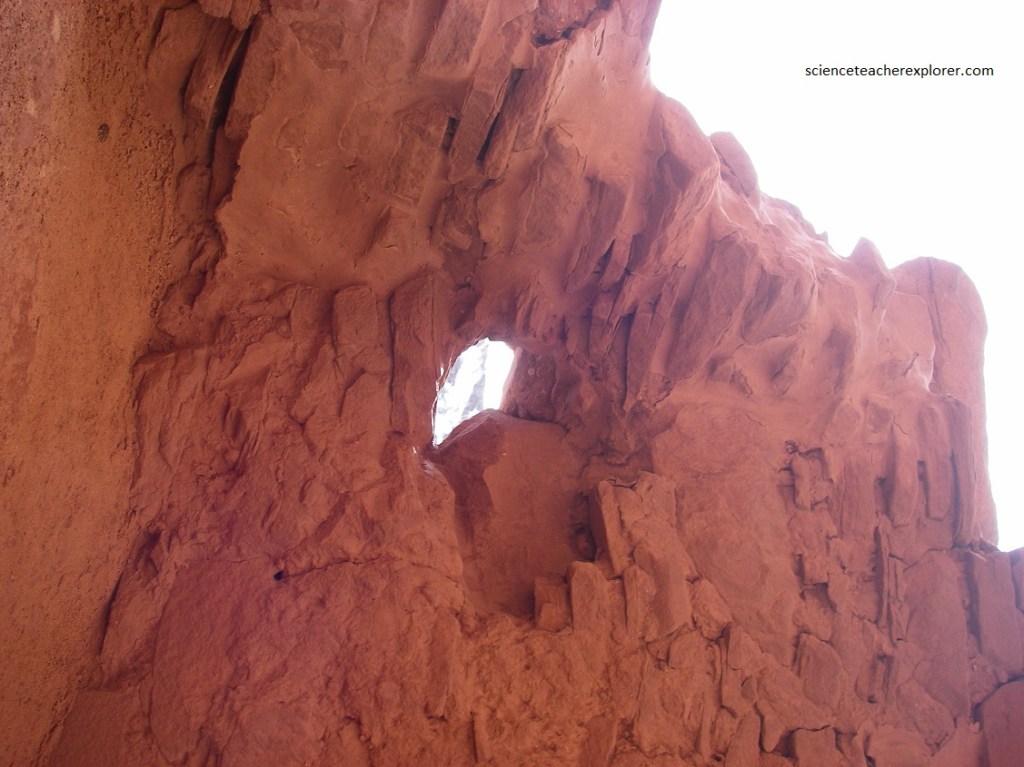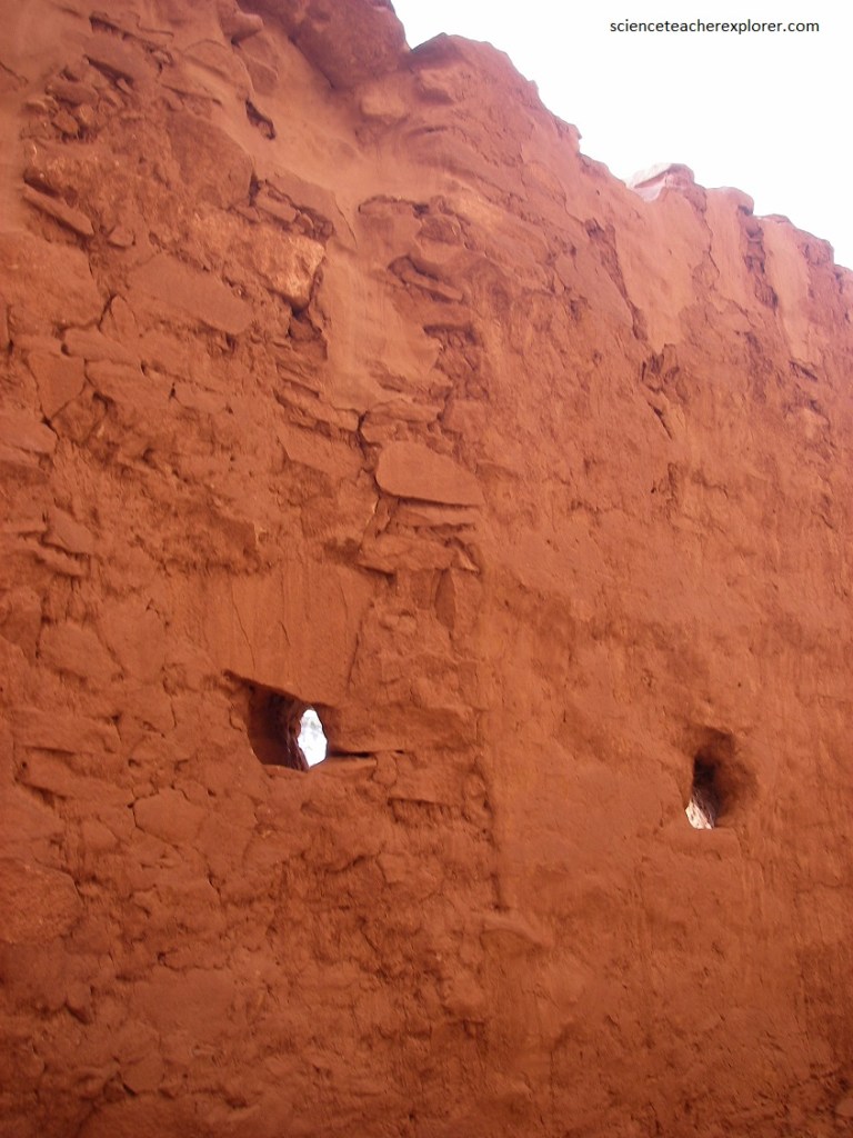 I returned with a small group of students (five) in 2005, on the Summer Solstice (June 21st of 2005) to see if my hypothesis worked. Were these holes placed in the wall for astronomical reasons? In other Ancient Pueblo sites in the 4-corners area, ancient structures indicate an understanding of the Sun’s movements. The holes in the wall could provide a window the lets a beam of light shine into the cliff-dwelling on the back wall at the Summer Solstice, (pictured below).