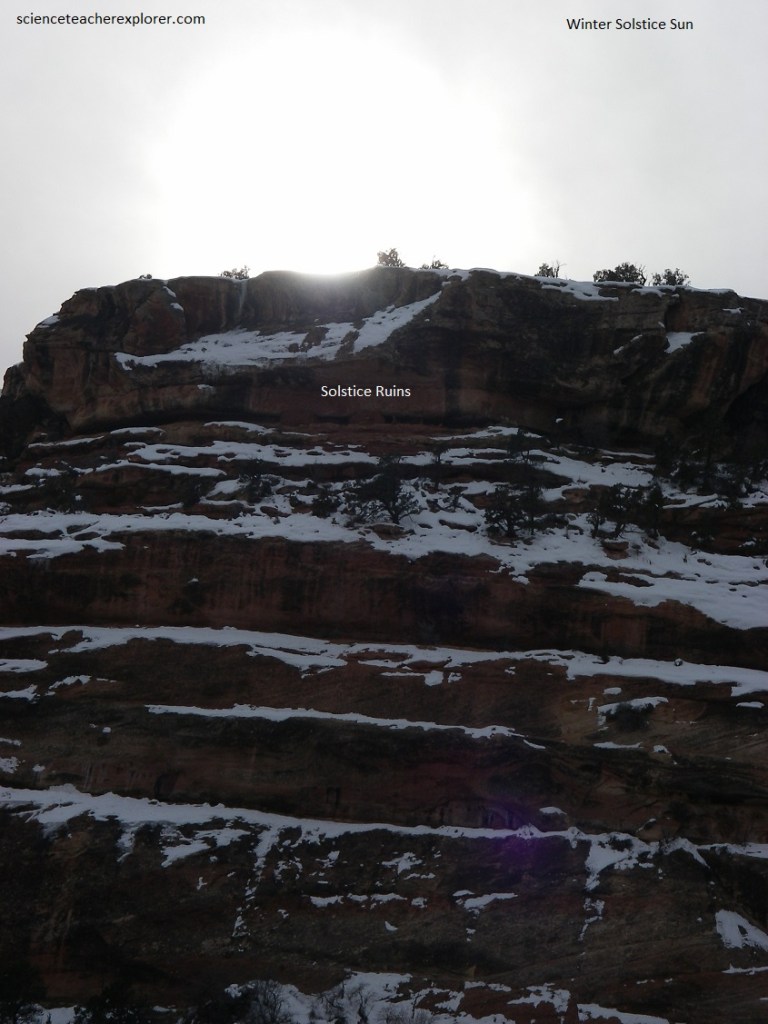 The next morning, Dec. 22nd I revisited the Lower Mule Canyon. But this time I hiked down the west rim to where the out-of-place ruins were. Again, it is rare to find Ancient Pueblo dwellings on the northwest slope of a canyon. However, these dwellings were built under the alignment of the Winter-Solstice sun-down location, (pictured below).
