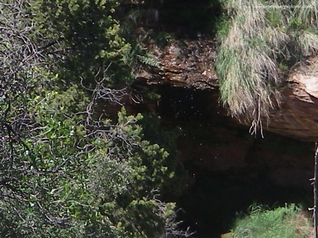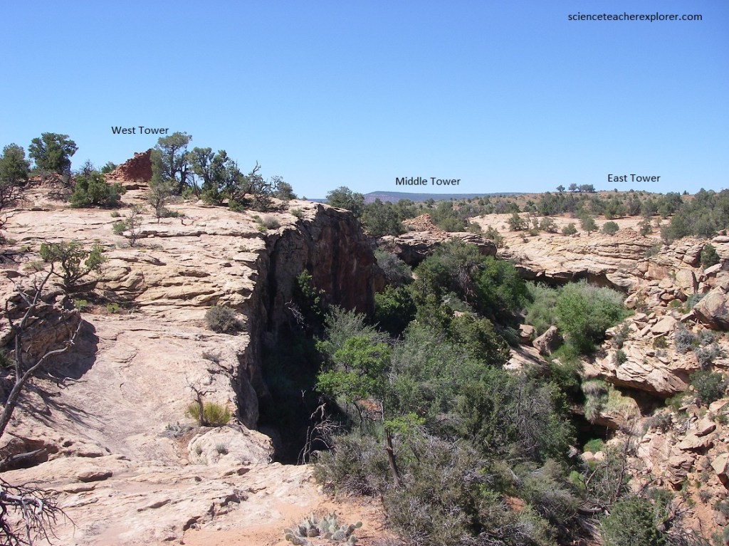 Pictured below, the towers surround a cave with a spring. The site was occupied around 1100 A.D.. From the East Tower, along the rim, we found a tunnel the took us under the rim, where we climbed down to the first bench below. Once on the first bench we walked back to visit the spring and large alcove below the dry-fall.