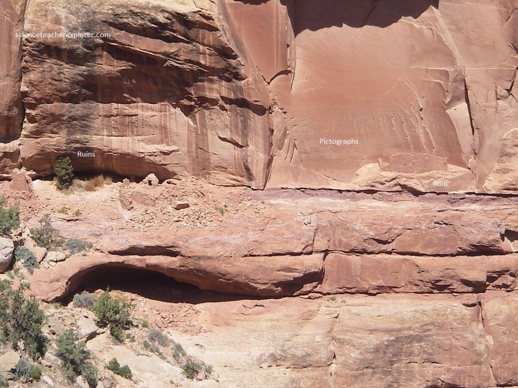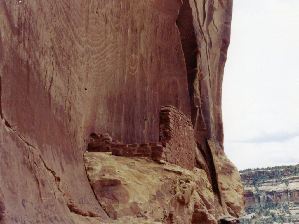 As the canyon drops steeply from the towers, the exposed rock layers provide a lot of good building sites. None of the cliff dwellings in the canyon, or the towers on the rim, have been stabilized or restored in any fashion. Pictured below, are a great number of ruins on the left. But as we scrambled to the cliff face, we noticed a wall that was precariously perched on a cliff on the right. There were several spectacular petroglyphs leading out it. And, above the wall was a giant Pictograph of an angry smiley face.