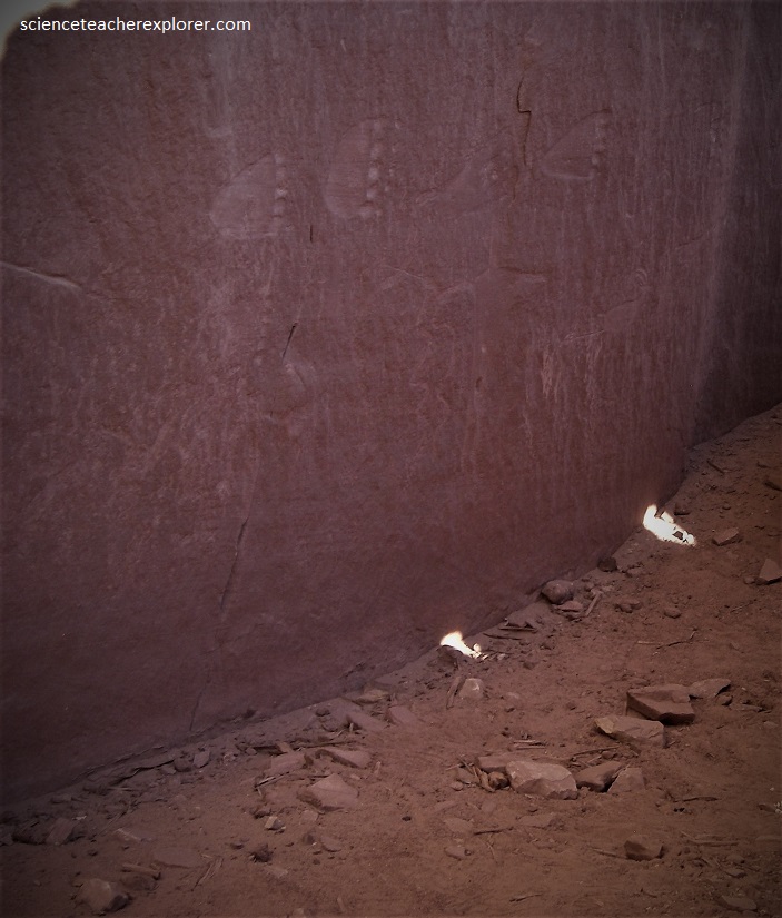 Apparently, the Lower Mule Canyon Ancient Pueblo people found a variety of way to chart the arrival of the equinoxes, solstices and other important “dates” in the year. These included observing the sun’s position on the horizon at sunset, patterns of sunlight and shadow on spiral petroglyphs, patterns of sunlight and shadow on natural features on the landscape, and the alignment of the sun with architectural structures.