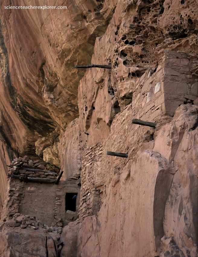 Pictured above was our last ruin before we turned around and headed back. Pictured above, Wall Ruin was the best, most unusual ruin in the south Fork of Mule Canyon. It was situated half way along a short side ravine (6.2 km from the start), which contained a small stream, flowing through tall, segmented reeds. The rooms of the dwelling are built into ledges and alcoves on a vertical cliff face, the surface of which had been eroded into many tiny cavities. Protruding posts showed in 2001, where ladders were used to be tethered and allow for entry into the different levels. The upper parts of the ruin were quite inaccessible, but the lower story could be reached by climbing 5 meters, using a log that was provided by an earlier group. The Wall Ruin site had various passageways and small rooms, with intact ceilings and relics on the floor, (in 2001), including metate stones and pieces of pottery and corn cobs.