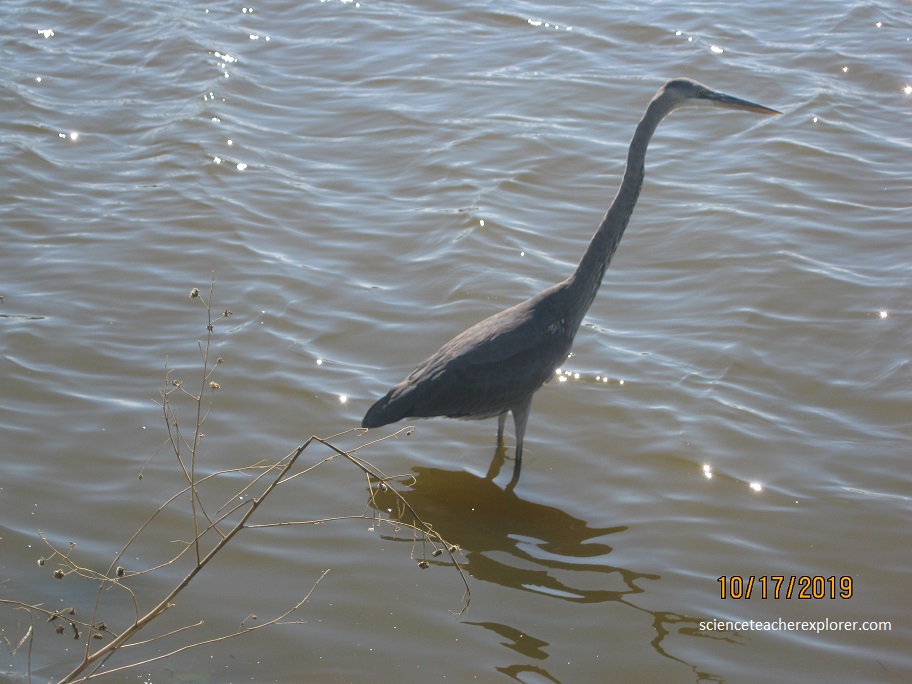 Pictured below, is a Little Blue Heron. Adult Little Blue Herons are very dark all over. At close range or in good light, they have a rich purple-maroon head and neck and dark slaty-blue body. They have yellow eyes, greenish legs, and a bill that is pale blue at the base, black at the tip. The Little Blue Heron is a stand-and-wait predator, rather than a frenetic, dashing-about predator. They watch the water for fish and other small morsels, changing locations by walking slowly or by flying to a completely different site.