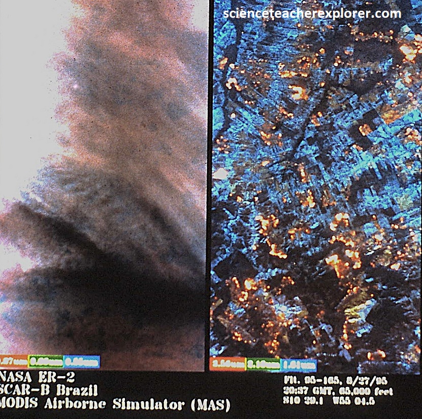 Pictured above, slash-and-burn agriculture, where land is cleared for crops and livestock by cutting down and burning vegetation, is a significant cause of deforestation and fires in the Brazilian Amazon. These fires release large amounts of carbon and other pollutants into the atmosphere, impacting the climate and air quality world-wide. The practice is often used by government soldiers, farmers and ranchers who are clearing land for agriculture or cattle ranching. {Images below were provided by Timothy L. Williams, NASA research pilot of the Ames Research Center for educational purposes in 1996}.
