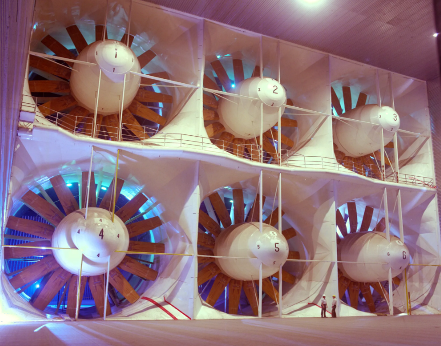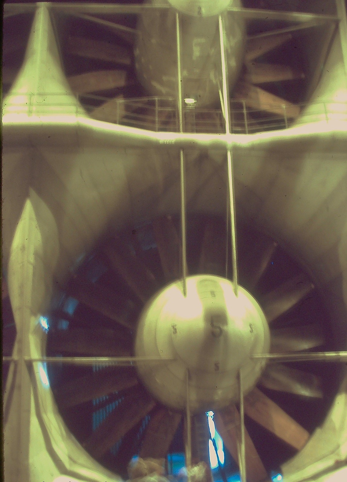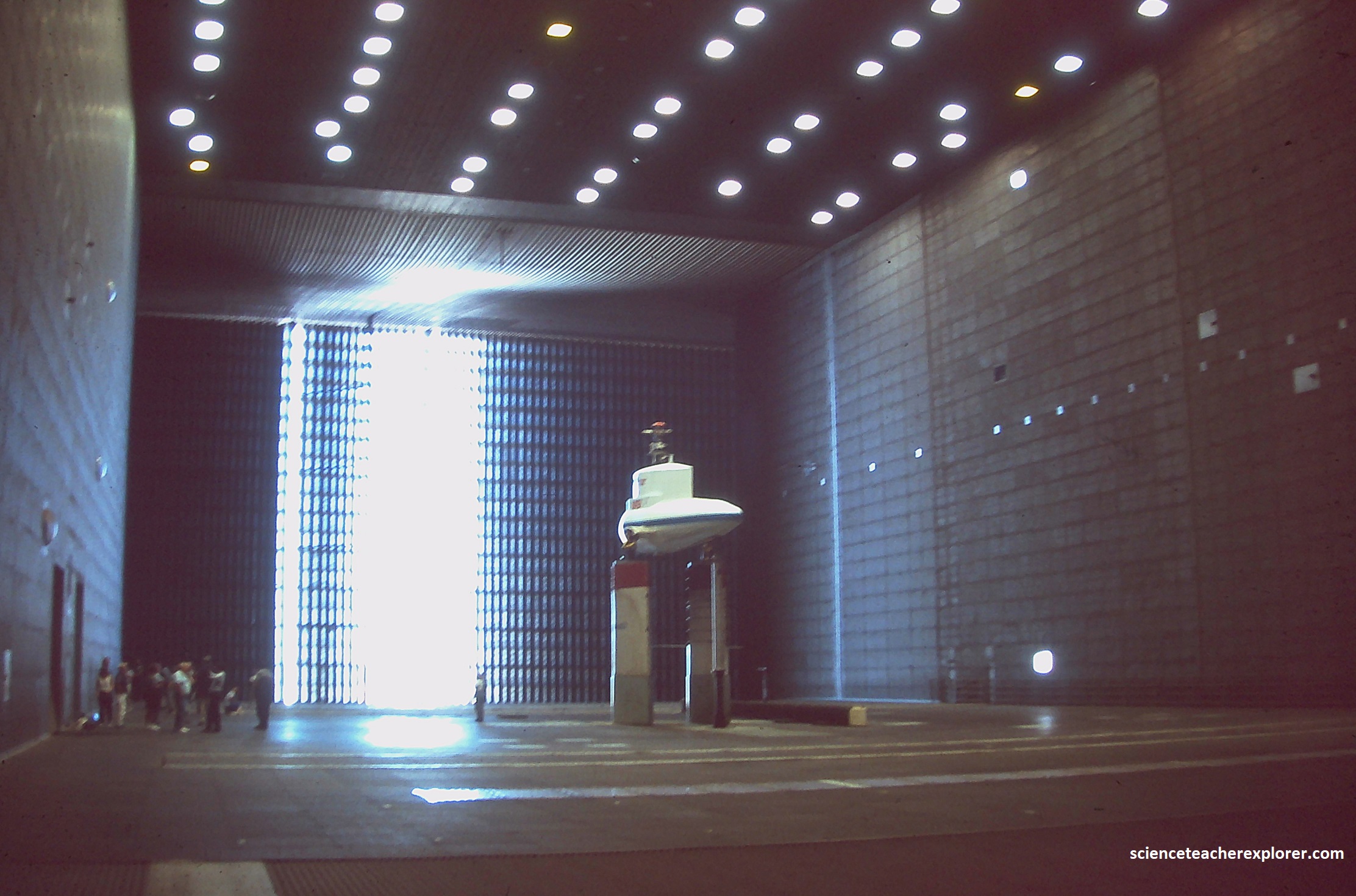 Pictured above, was our small group, touring the inside of the massive (80 x 120) ft Wind Tunnel. I obviously asked to see the giant turbines that would create these large velocity winds. However, my comment was blown-off by the guide, (pardon the pun). So, I did a massive no, no! When our group left the chamber, I did a quick run down to the turbines to get the picture you see above. Unfortunately, this set off alarms, and I was accosted by the Military Police Officers. This is when I learned that the place was managed by the United States Airforce. I told them that I was just an innocent educator and the turbines was the most interesting part of the massive wind tunnels. By withholding that information, when your only a few meters away, was just mean. They agreed and let me go. But then they provided me with the better photo seen below. Now it is a public domain image and I would like to believe that I caused that.