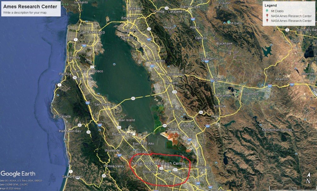 The NASA Ames Research Center is about 48 km south of San Francisco International Airport and about 24 km north of San Jose Airport. From San Francisco International Airport, I took US-101 (Bayshore Freeway) south. I then exited at 398A and turned right onto Moffett Blvd. and proceeded to the Main Gate Entrance.