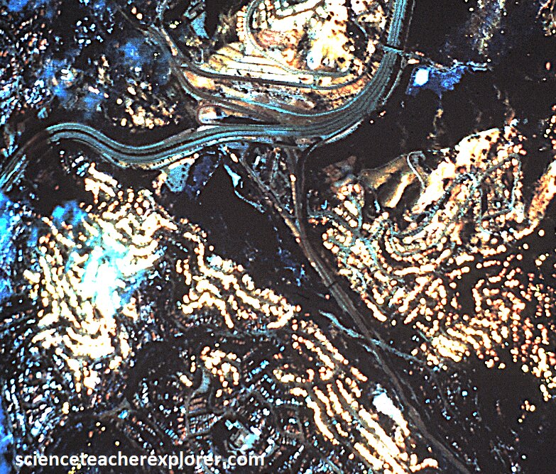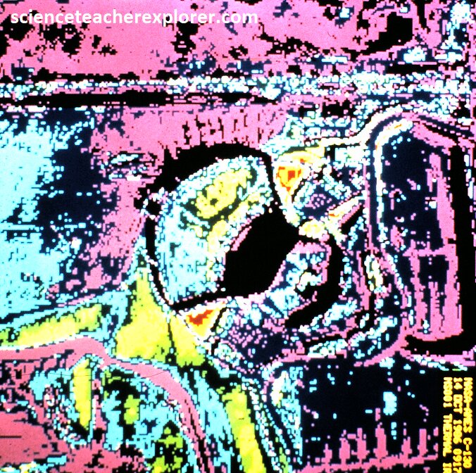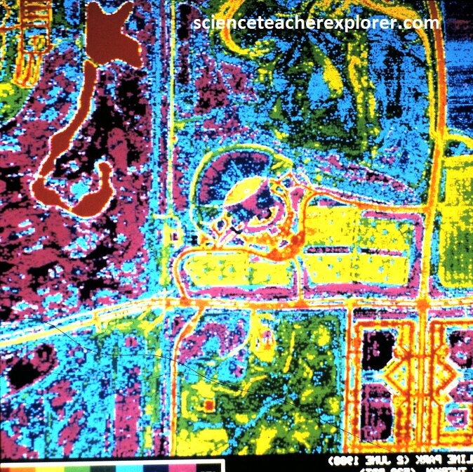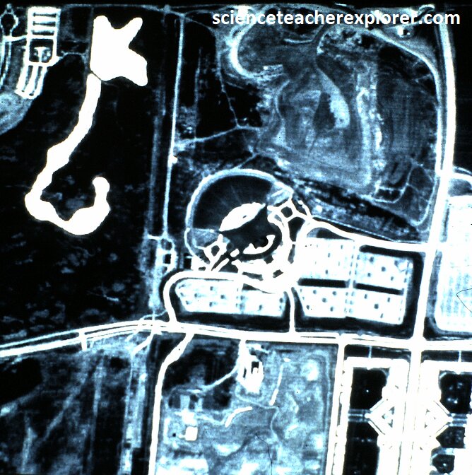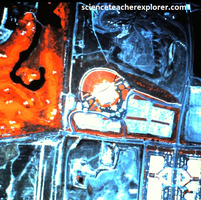 Pictured above, are the Optical Negative (black & white), and the IR-Thermal images of Candlestick-Park Stadium in San Francisco. We use the term of “images” to indicate the different infrared wavelengths (long & short IR) by assigning each a different color. The last image indicates that half of stadium emits a different wavelength than the other half. It was actually indicating an infra-red wavelength that matched the chemical signature of methane, (yellow). After a little historical research, Candlestick Park stadium was built on an old pig-farm. The methane was probably a remnant chemical-signature of it’s past pollution. This could answer questions about head-aches or health issues while watching a ball-game within the stadium. {Images below were provided by Timothy L. Williams, NASA research pilot of the Ames Research Center for educational purposes in 1996}.