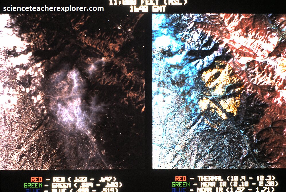 Pictured above, is the optical (left) & infrared (middle & right) photos of the the Oakland firestorm of 1991, also known as the Tunnel Fire. This disaster was a large suburban wildland-urban conflagration that occurred on the hillsides of northern northern Oakland, California, and southeastern Berkeley. The fire ultimately killed 25 people and injured 150 others. The 1,520 acres (620 ha) destroyed included 2,843 single-family dwellings and 437 apartment and condominium units. {Note the above photo on the right shows each individual structure lit-up with bright yellow on the IR-photo. The economic loss from the fire was estimated at $1.5 billion. {Images below were provided by Timothy L. Williams, NASA research pilot of the Ames Research Center for educational purposes in 1996}.