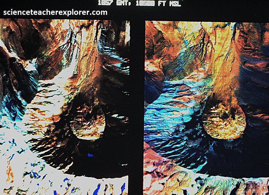 Pictured above, are the variety of the IR-thermo-images of the Mount St. Helens volcano in 1995. Note that the image on the above-right shows the hot-spots within the crater. Mount St. Helens volcano lies 83 km northeast of Portland, Oregon; and 158 km south of Seattle. It erupted in 1980 and remains the deadliest and most economically destructive volcanic event in U.S. history. 57 people were killed; 200 homes, 47 bridges, 24 km of railways, and 298 km of highway were destroyed. A massive debris avalanche, triggered by a 5.1 magnitude earthquake and caused a lateral eruption that reduced the elevation of the mountain’s summit from 2,950 to 2,549 m, leaving a 1.6 km wide horseshoe-shaped crater, (pictured above). The debris avalanche was 2.5 km3 in volume. {Images below were provided by Timothy L. Williams, NASA research pilot of the Ames Research Center for educational purposes in 1996}.