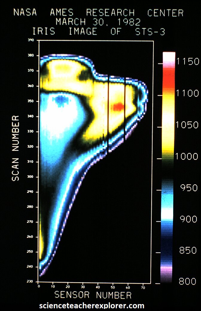 Pictured above, are optical (left) and IR-thermal photos of the NASA Columbia Space-Shuttle entering the atmosphere after the STS-3 mission in 1982. The STS-3 mission focused on orbital endurance testing and deploying scientific payloads, including a Canadian-built Remote Manipulator System (RMS) arm. Notice in the IR-thermal photo shows a hot-spot over the center point of the left wing. The wind-tunnel computational-analysis at Ames Research Center shows the correlating connection with a turbulent zone behind the wing and the hot-spot, (pictured above on the right). I asked Mr. Williams if this would be a problem if NASA ever lost a heat-shielding during take-off. He responded that this is exactly what happened during a 1988 top-secret mission for the Atlantis shuttle, (they damaged 700 heat-shield tiles and lost one completely when releasing the booster rockets during take-off). The Astronauts were lucky to make it back! However, when the Columbia lost it’s heat shields on it’s left wing during take-off in 2003, I wasn’t surprised when they didn’t make it back. Apparently, it disintegrated as it re-entered the atmosphere over Texas and Louisiana, killing all 7 astronauts on board. This missing heat shield was on the shuttle’s left wing. {The “missing heat shield” was actually a hole in the Reinforced Carbon-Carbon (RCC) panel on the leading edge of the left wing}. Having the above photos and mentioning my concerns in 1996, made it a spooky & sad coincidence in 2003, after Columbia’s last mission. I was given one of the heat shield plates to use in my physics demonstrations with a propane torch.