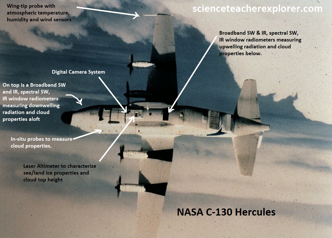 Another aircraft that Mr. Williams flew at the Ames Research Center was the NASA C-130. This Lockheed C-130 “Hercules” aircraft is a four-engine, medium-size utility aircraft that has proven to be one of the most well-known and versatile aircraft ever built. It performs a variety of research missions at altitudes below about 26,000 feet. With its excellent low altitude performance and heavy lift capabilities, the C-130 is ideal for studying the planetary boundary layer and lower to mid-tropospheric chemistry missions. In addition to NASAs standard thermodynamic, wind and turbulence, microphysics, radiation, and trace gas instruments, the C-130 has a roomy fuselage payload area that can accommodate many rack-mounted instruments with access to several inlets and optical ports. It also had the capabilities of having instruments pointed upwards toward the upper atmosphere. {Images below were provided by Timothy L. Williams, NASA research pilot of the Ames Research Center for educational purposes in 1996}.