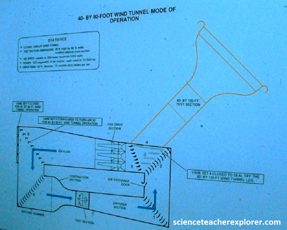 Home to the world’s two largest wind tunnels, the National Full-Scale Aerodynamics Complex at Ames is used to determine how air flows around full-scale vehicles and large-scale test models at speeds as fast as 190 km/hr, (120 miles/hr) or 100 knots. The first test section, built by NACA in 1944, has a cross-sectional area of 40 feet by 80 feet. In 1987, NASA added the second tunnel test section, which measures 80 feet by 120 feet, (pictured & imaged above).