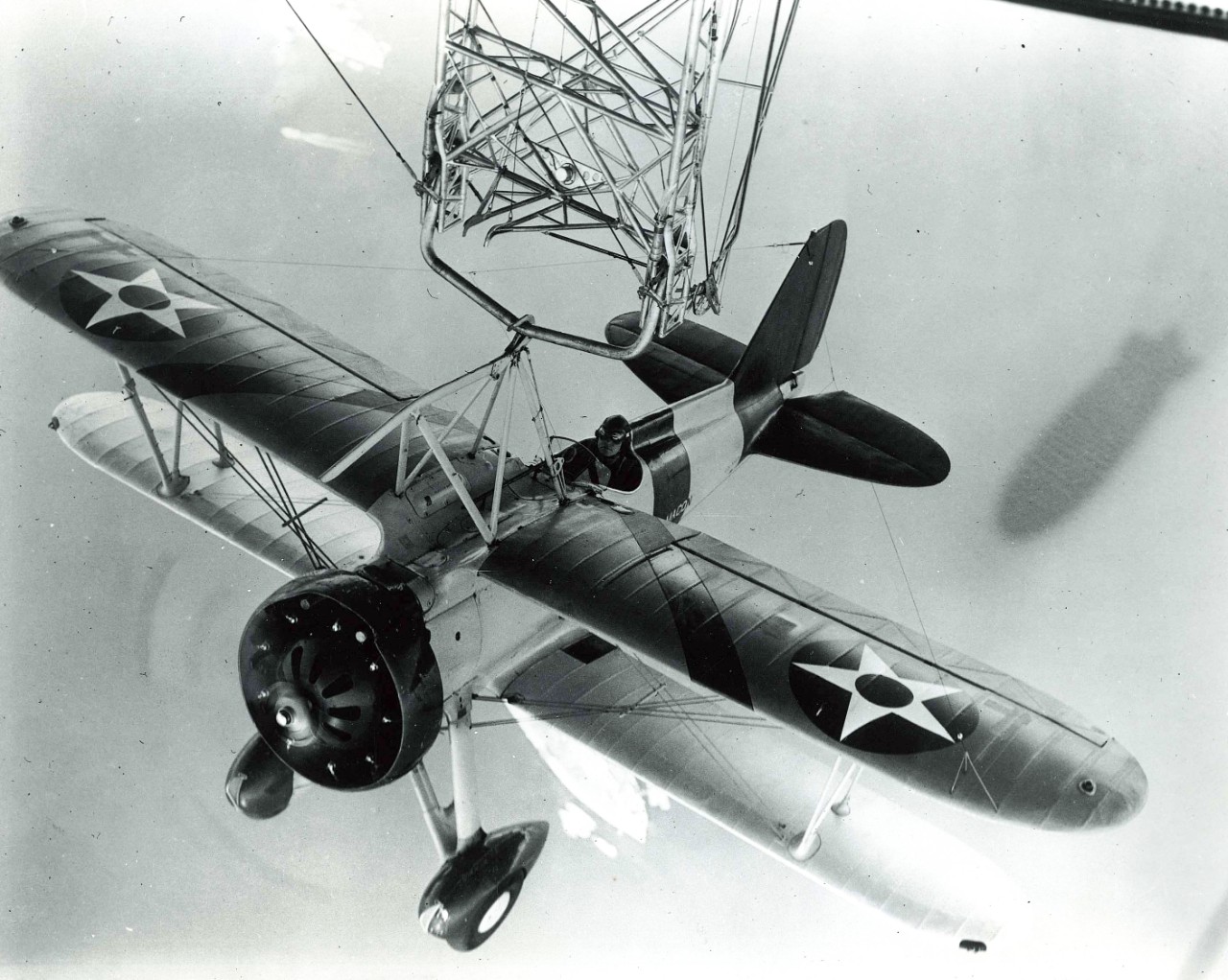 Pictured below, my first tour of the facility was the historic Hanger #1 on Moffett Field. This enormous structure was designed to house two dirigible airships in the early 1930s, called the USS Macon & USS Akron. Both utilized Helium gas and were 6,500,000 cubic foot ships with eight power plants, which enabled propeller movement in all directions. Amazingly, they also stowed onboard, four small scout or fighter-type aircraft, which could be brought onboard via retractable trapeze. I had no idea that you could land an airplane on one of these airships, (pictured below). {Note: the two pictures below and on the right were provided by a interpretive-folder on-site.}
