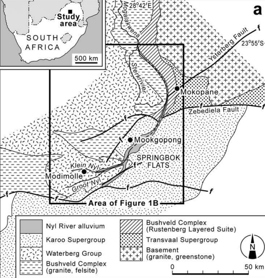 The immediate area around the Nyl/Mogalakwena River lies within a down-warped basin composed of rocks from the Pretoria Group and the Rooiberg felsites of the Bushveld Complex, in addition to the Waterberg Group in the extreme west.