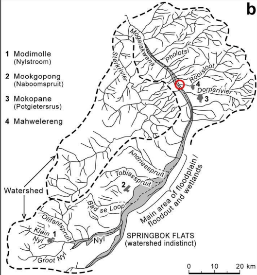 The Nyl River floodplain stretches from south-west to north-east across the western edge of the Springbok Flats, lying alongside the eastern foothills of the Waterberg plateau, (this plateau is the source-area for the floodplain’s water). There are about a dozen streams and rivers that bring water from the Waterberg onto the floodplain; the largest of these are the Klein Nyl, the Groot Nyl and the Olifantsspruit, (imaged above).