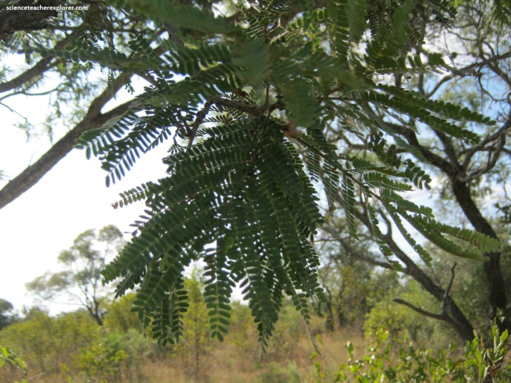 Pictured above and below, the Sweet thorn tree is one of the most common trees in the greater part of South Africa. It has therefore adapted to large fluctuations in temperature and moisture. This species varies considerably in growth form. In the Limpopo, it is a long, slender tree. The bark is smooth and black that is longitudinally fissured. The leaves are dark green and bipinnately compounded, (pictured below).