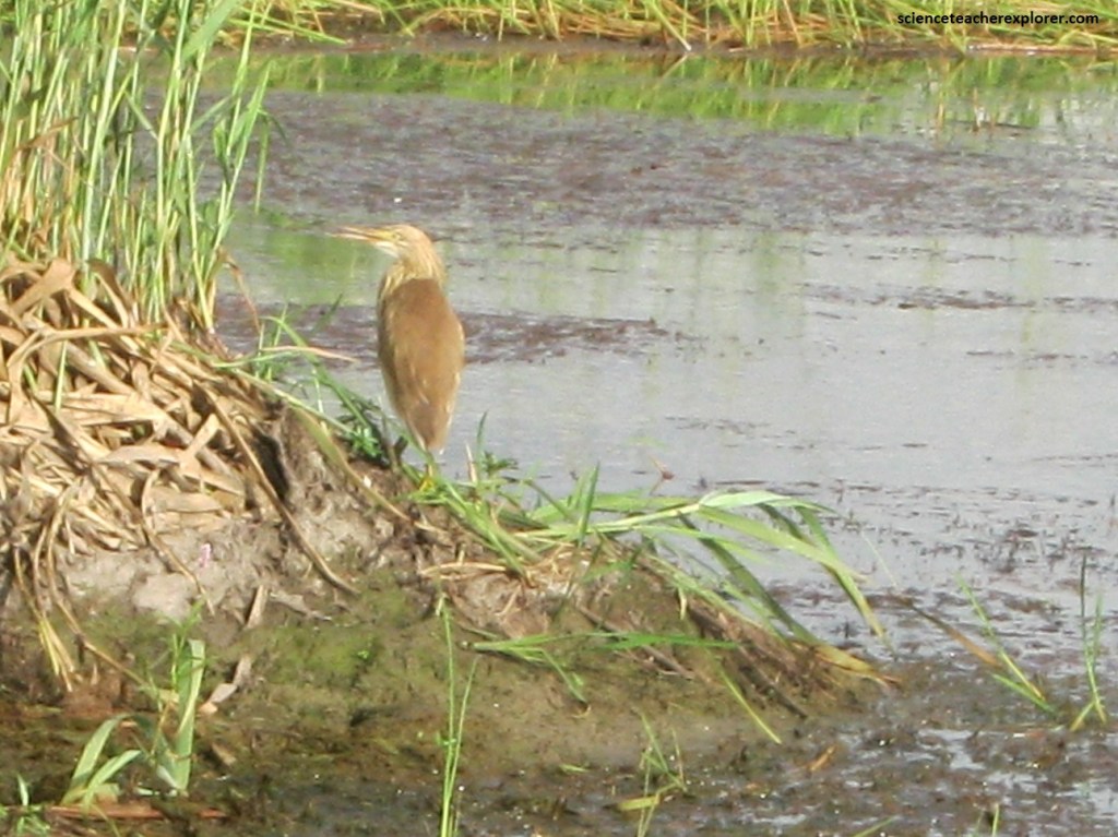 Pictured above, the Squacco Heron Ardeola ralloides is a very shy, light brown heron with dark stripes on the neck. The yellowish bill turn blue and the legs reddish during courtship. The white wings are conspicuous in flight. Forages in shallow water with enough shelter.