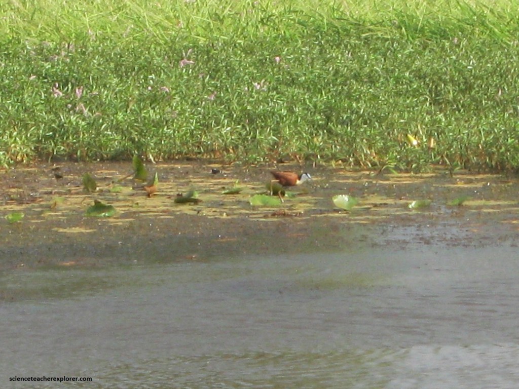 Pictured above, The African Jacana, (Actophilnis africanus) has the characteristic of long toes to enable them to walk on floating vegetation. This white neck and black nape contrasts with the rufous body. The male incubates the eggs and raises the chicks.