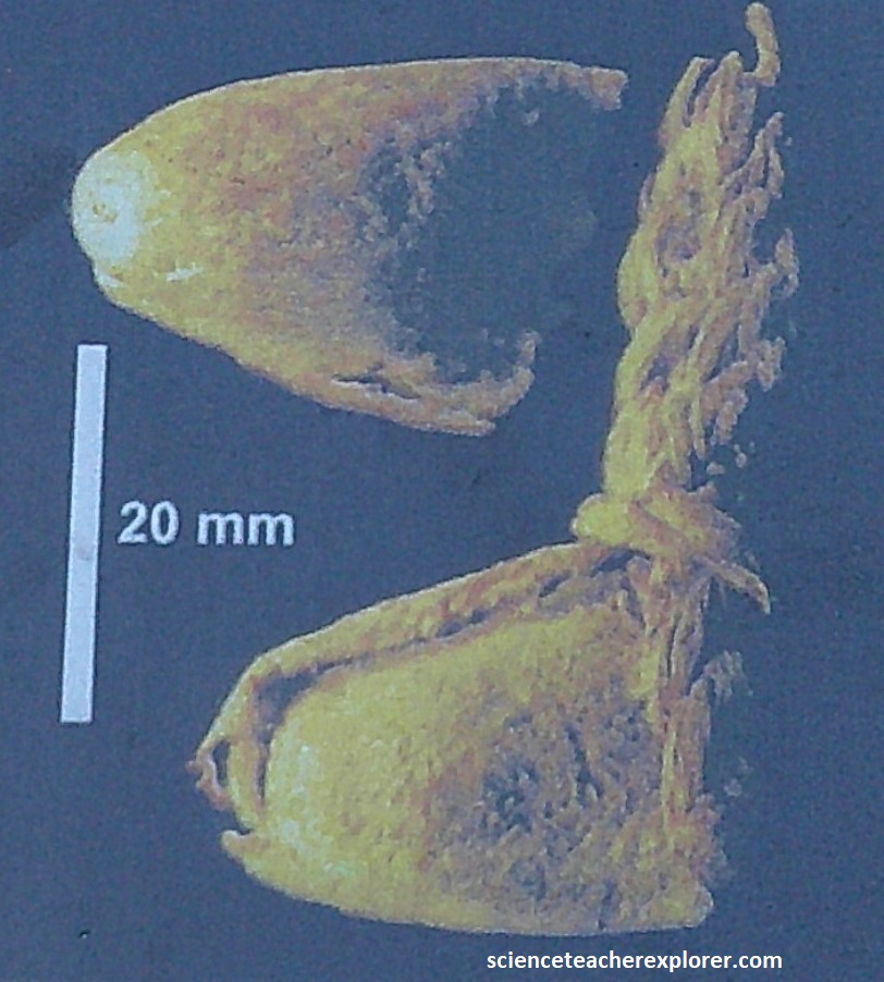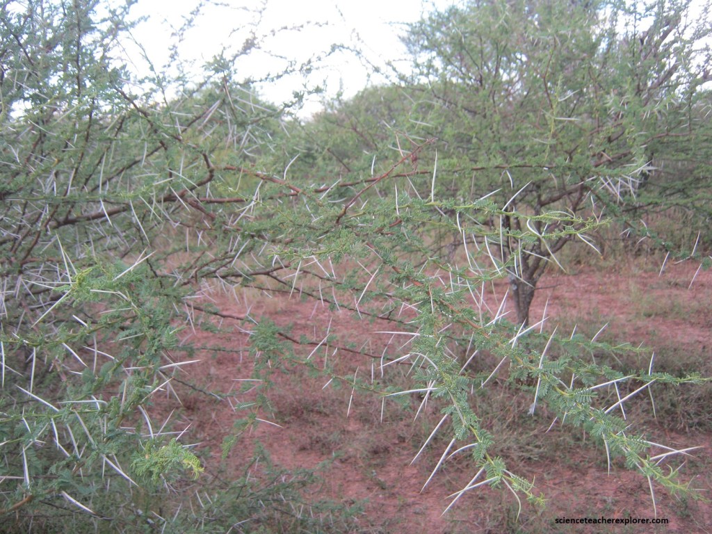 Pictured above, the Umbrella thorn Acacia tortilis is deciduous and usually not more than 10 m high. A well-known, conspicuous umbrella-shaped crown is only fully developed in old specimens, young tree, (like this one), have roundish or flat-topped crowns. The stem is usually fairly short and the main branches are bare. The very sharp spines of this plant are unique, some are short, blackish and hooked, while this one is long, white and straight. The leaves are bipinnately compound and probably the smallest among the thorn trees.