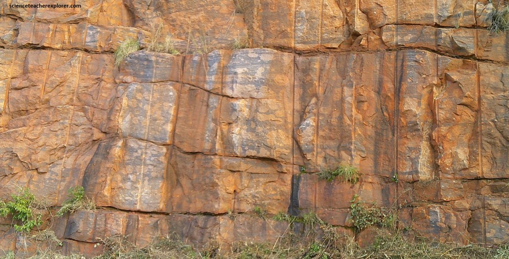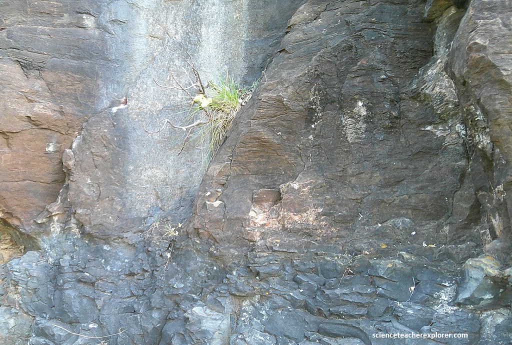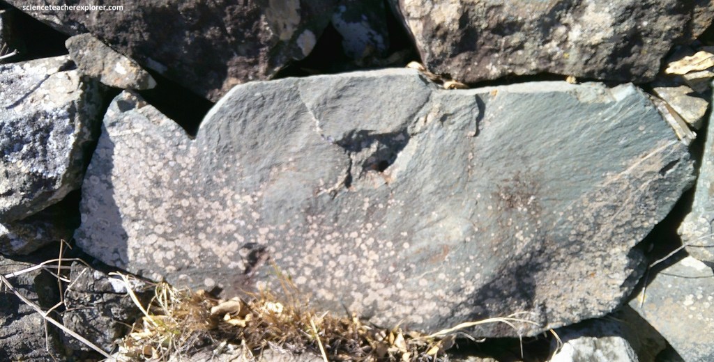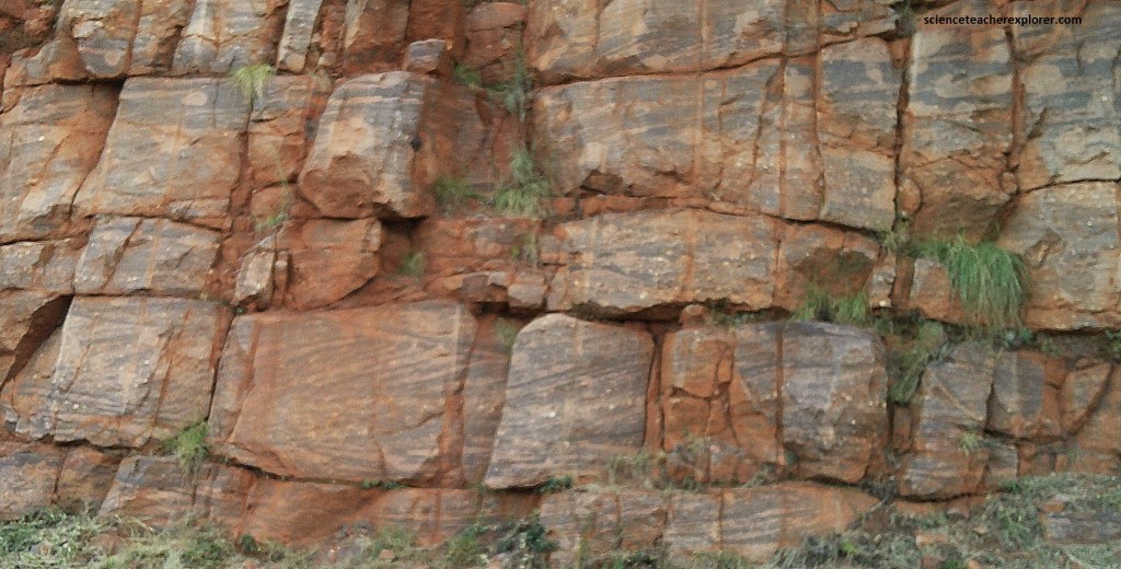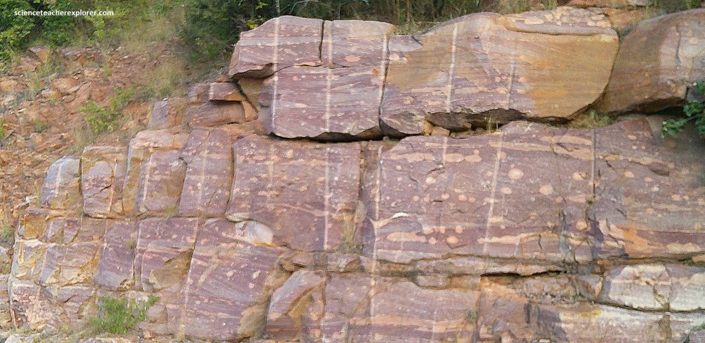 Pictured above, the road cut shows rocks with countless irregular, rounded or elongated bleached patches. These are also called ‘reduction spots’ where the rock has been locally leached. The alteration cross-cuts sedimentary structures and destroys diagenetic hematite, so it is clearly a much later reaction. These common but enigmatic patches are the result of the much later leaching and removal of iron by ground water.