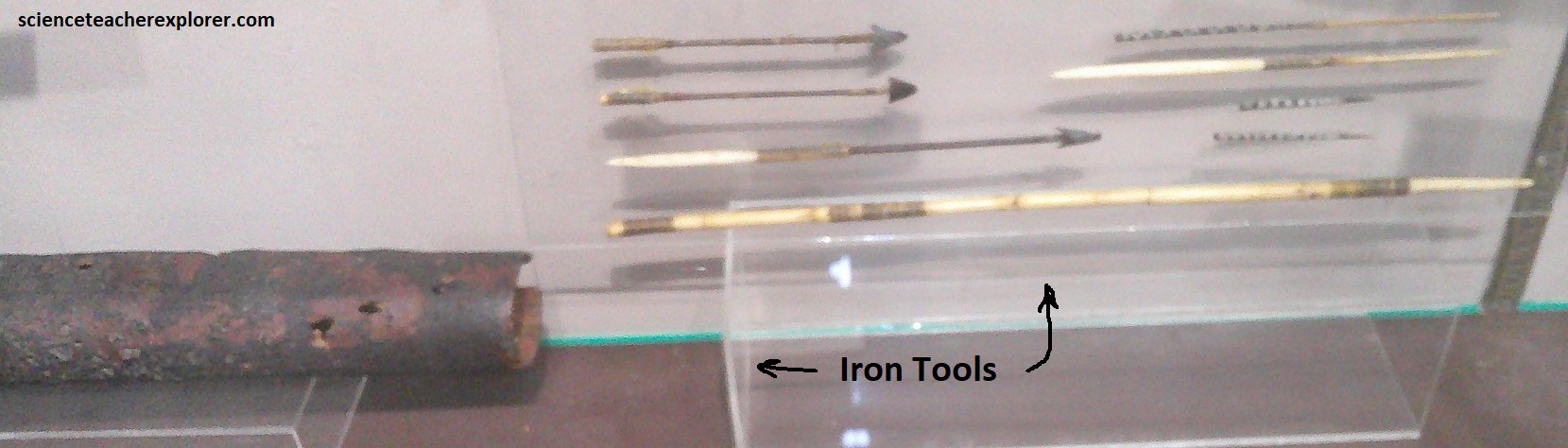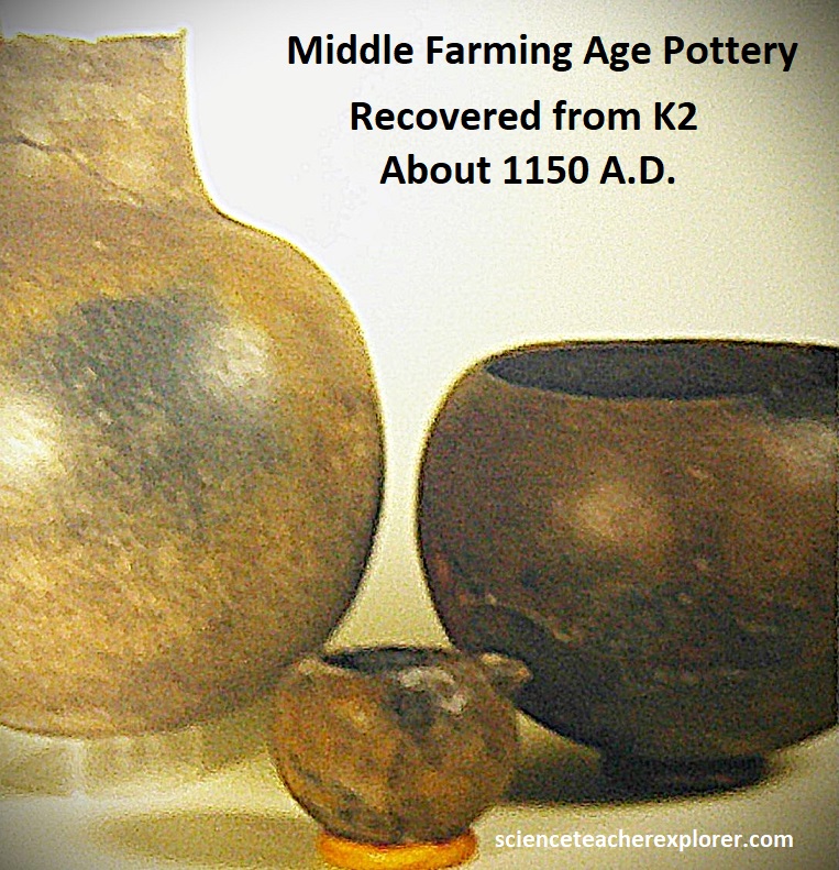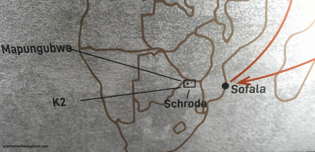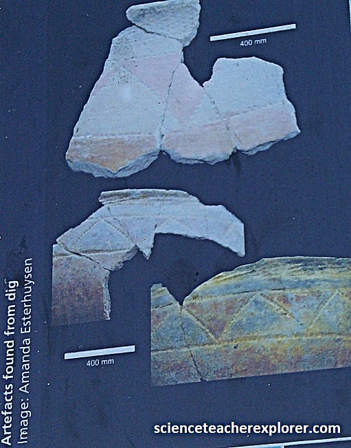 Between 1000 – 1200 A.D., political and economic power shifted from the Schroda site to K2 site, a few kilometers to the west with an estimated population of 7,000 people. They had smaller village settlements along the edges of the Limpopo floodplains. The growth in wealth from long-distance trade enabled the emergence of a class-based society. During this period, evidence shows a settlement hierarchy emerging with residents at the center exhibiting more wealth in cattle and imported luxury goods. {Pictured below are items excavated from the area and displayed on-site that are of the 1000-1200 A.D. age}.