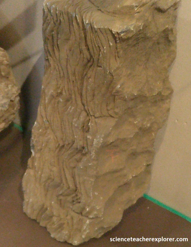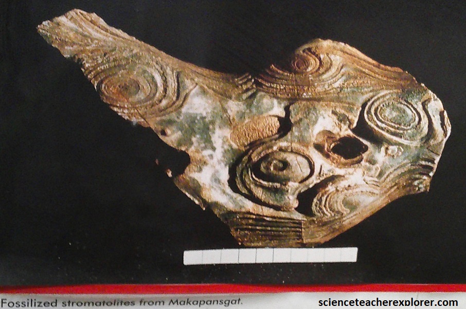 The original sediment for the Malmani dolomite was deposited in the shallow Transvaal Sea, around 2.6-2.5 billion years ago. Deposition took place during a geologically quiet period when the dominant life form was blue-green algae, (cyanobacteria), which formed vast marine mat-like algal layers and small domal mat-like algal layers & structures, (pictured below & displayed on-site). Today we see these as fine algal laminations and wavy stromatolite beds. (Note: the algae extracted carbon dioxide from the sea water by mean of photosynthesis, releasing oxygen in the sea water and chemically precipitating the calcium carbonate).