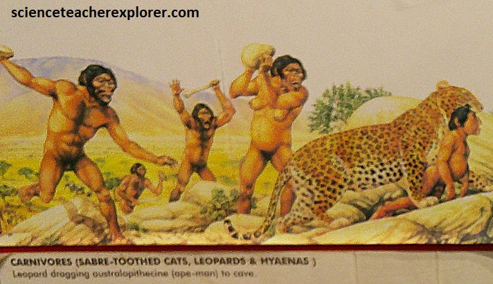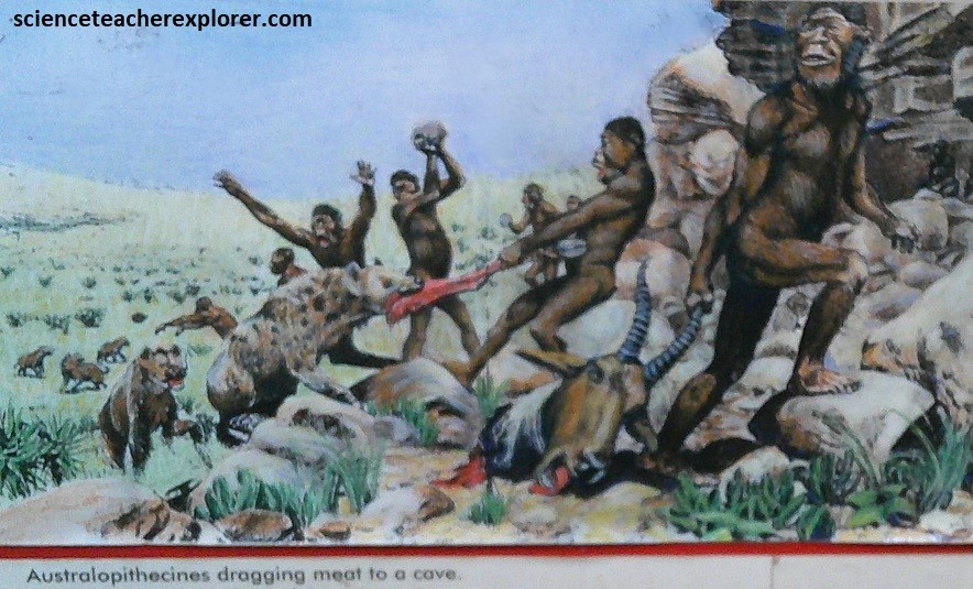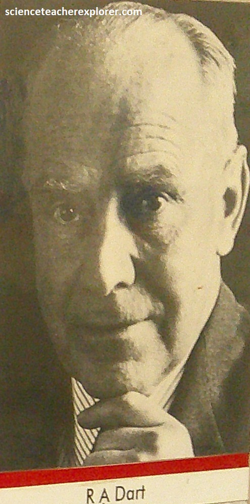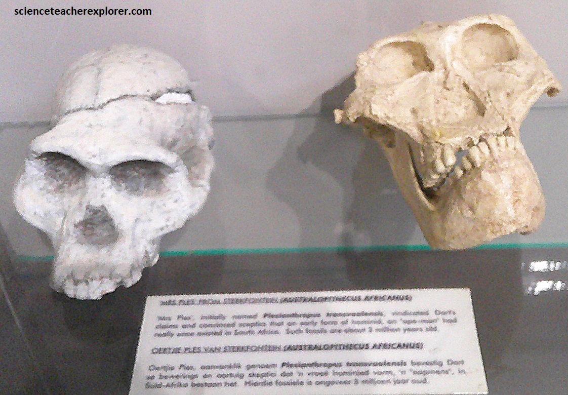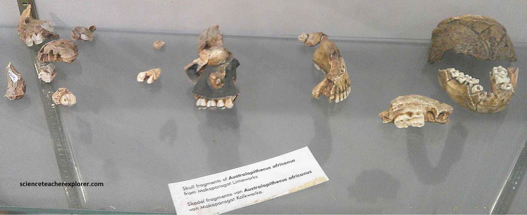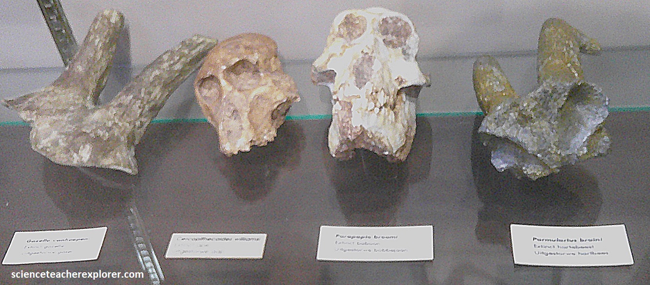 Among the bones discovered were a few hominid fossils. At first these were called Australopithecus prometheus, later renamed Australopithecus africanus. Dart concluded that the ape-man Australopithecus prometheus had manufactured and used implements made from bone, tooth and horn which he named the Osteodontokeratic Culture. Dart’s pioneering study received world-wide attention, and stimulated much research, although the cultural status of the Makapansgat hominid is much debated, (skulls seen below were displayed on-site).