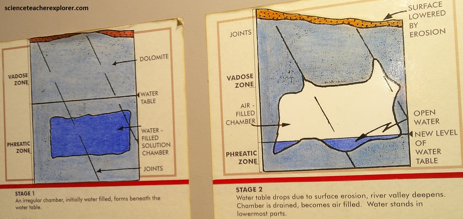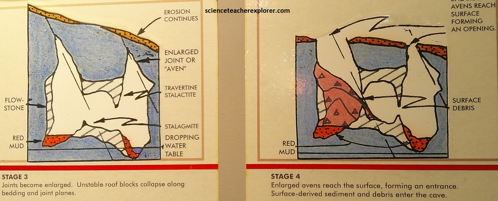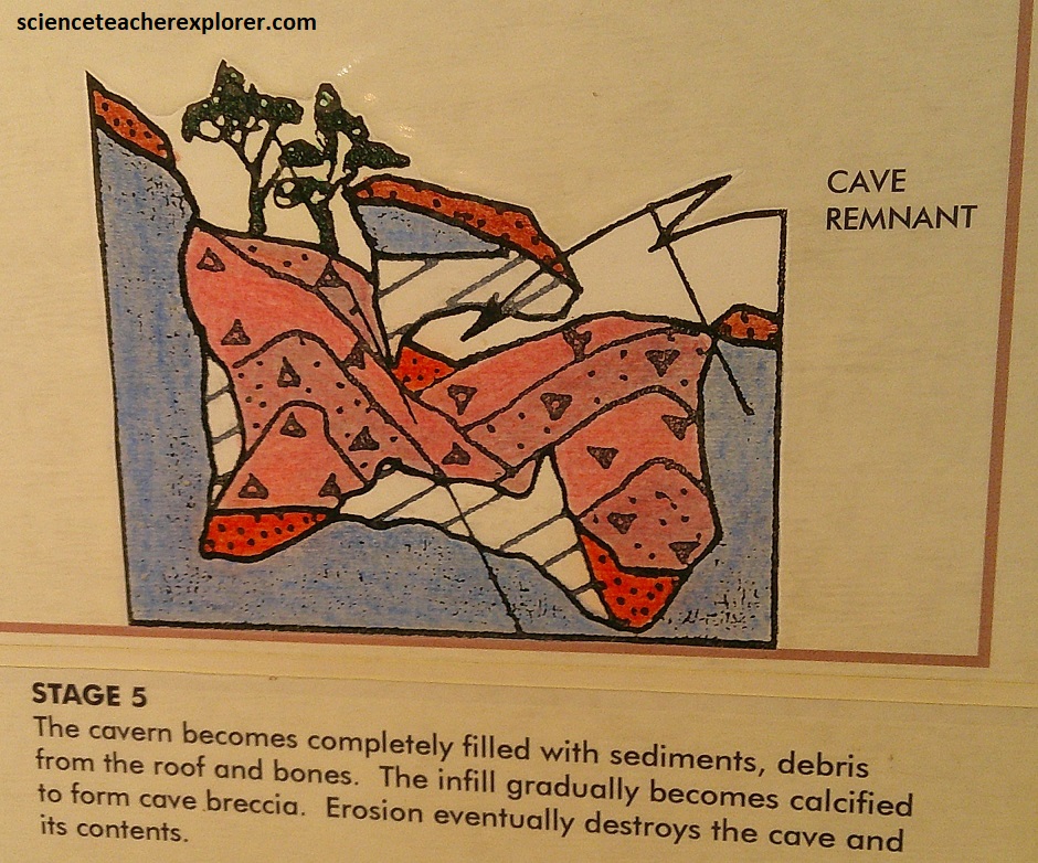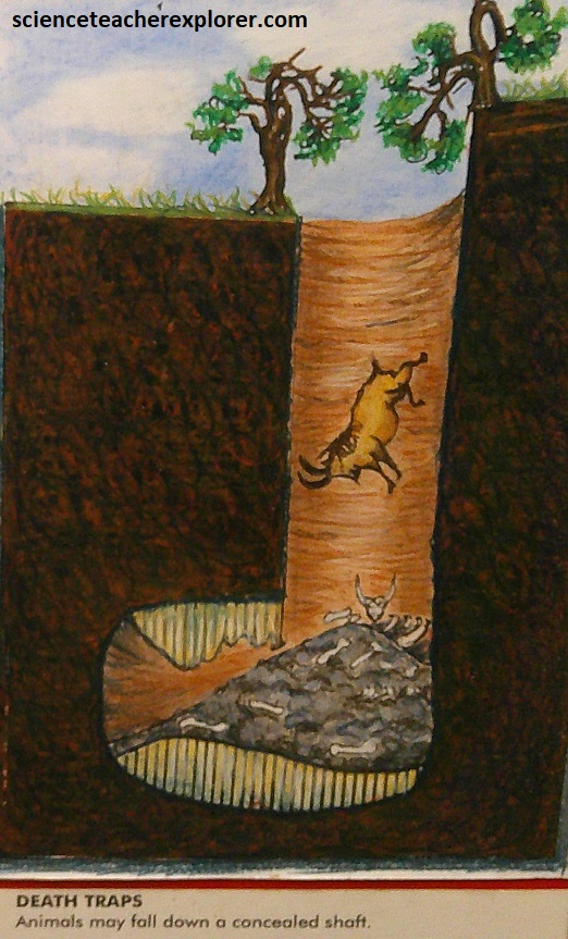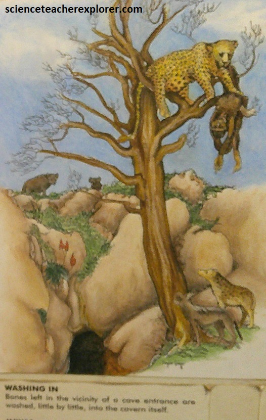 In 1947, more systematic work was carried out at other caves within the valley. However, Cave breccia at “Limeworks Cave” was carefully hand sorted to recover the enormous number of fossil bones that had accumulated in one spot, over millions of years. Below are possible reasons why the accumulation occurred; {the drawings below were taken from a display board on-site}.