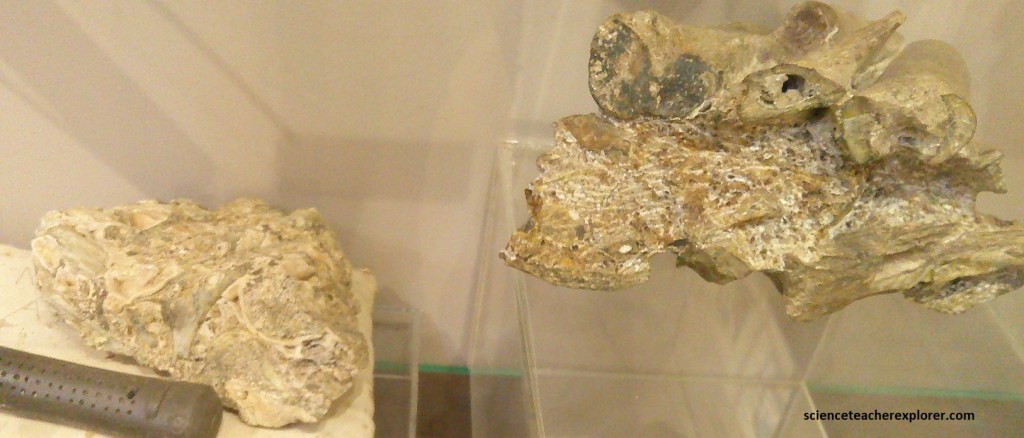 During Pleistocene times Makapans Valley was home to a great diversity of animal life, including insects, owls, giant horses, monkeys, apes, antelopes, and carnivores. In the “Cave of Hearths”, a number of the 3 million-year-old hominid specimens were also found. {The pictured below are bone fossils found within the “Limeworks breccia” & displayed below}